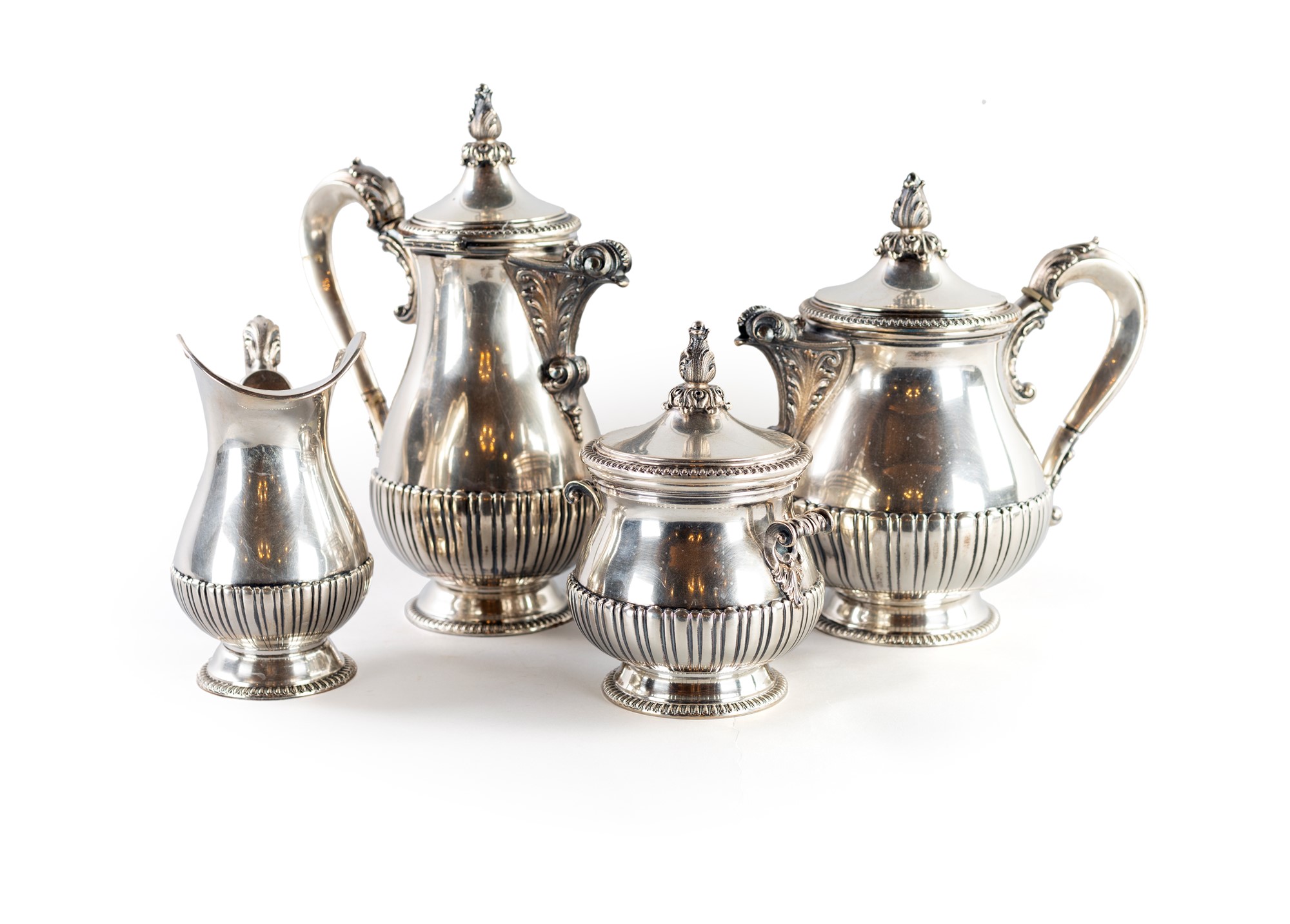 Servizio in argento 800/1000 - composto da teiera, caffettiera, lattiera e zuccheriera; ogni elemento è caratterizzato da nervature poste lungo la parte inferiore; i coperchi sono sormontati da pomolo in forma di carciofo allungato e i versatoi sono in forma di mensolone cesellato a motivi vegetali - altezza cm 23, cm 28, cm 17 e cm 18 rispettivamente - peso complessivo gr. 3080