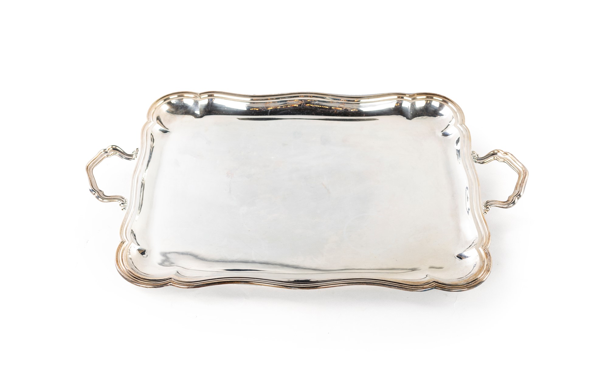 Grande vassoio in argento 800/1000 - di forma rettangolare con manici e bordo sagomato - cm 61x38 - gr. 2158