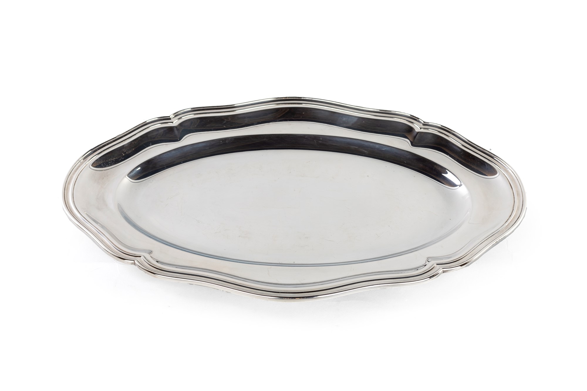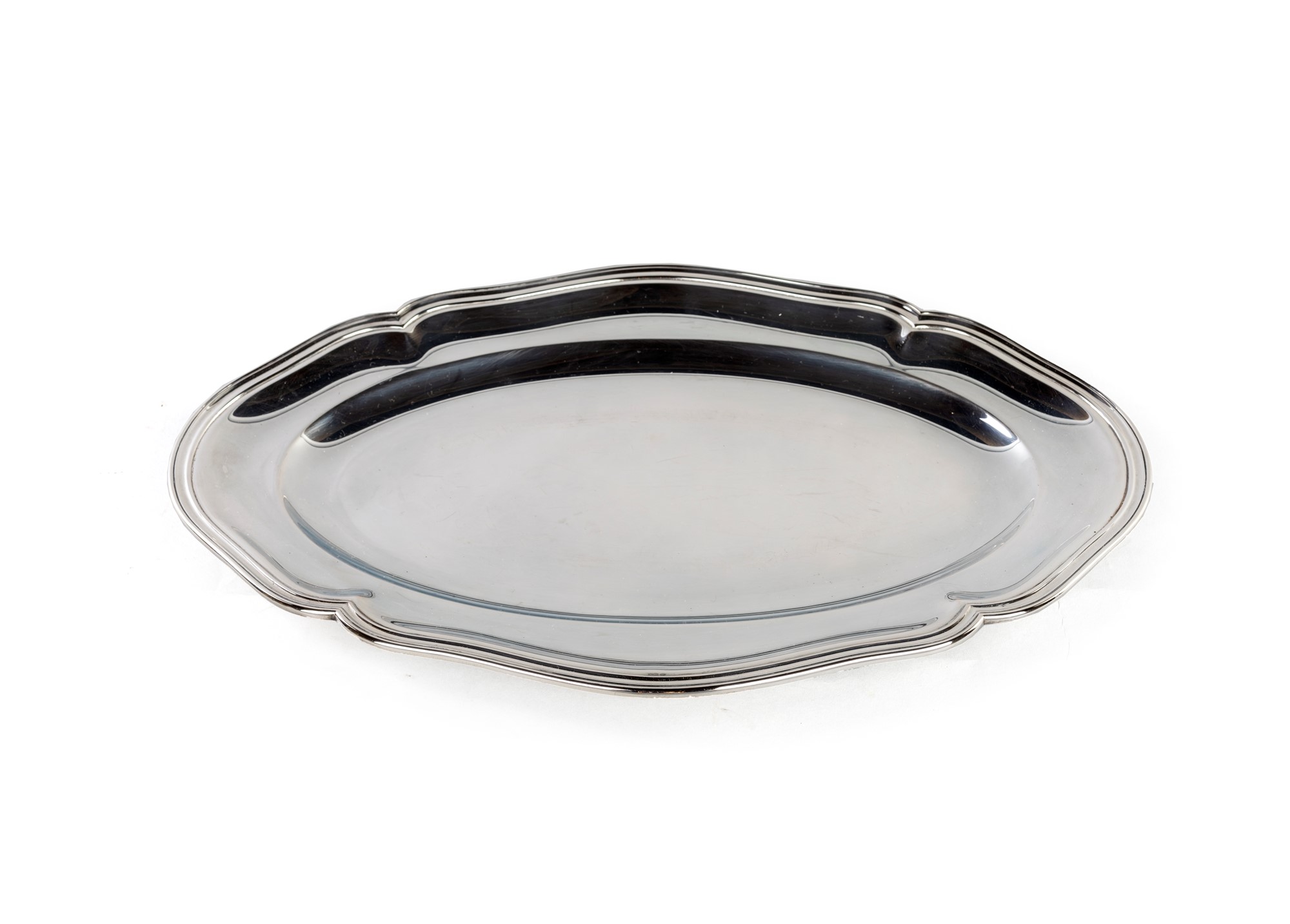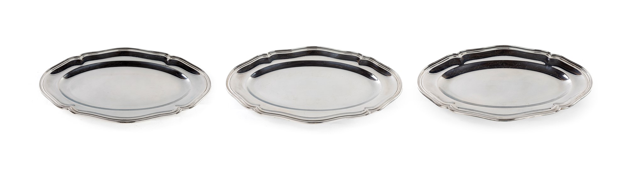 Tre piatti da portata in argento - di forma ovale e diverso formato, con profilo sagomato modanato - cm 43x26,5 - gr. 978, cm 46,5x30 - gr. 1094, cm 52x33 - gr. 1330