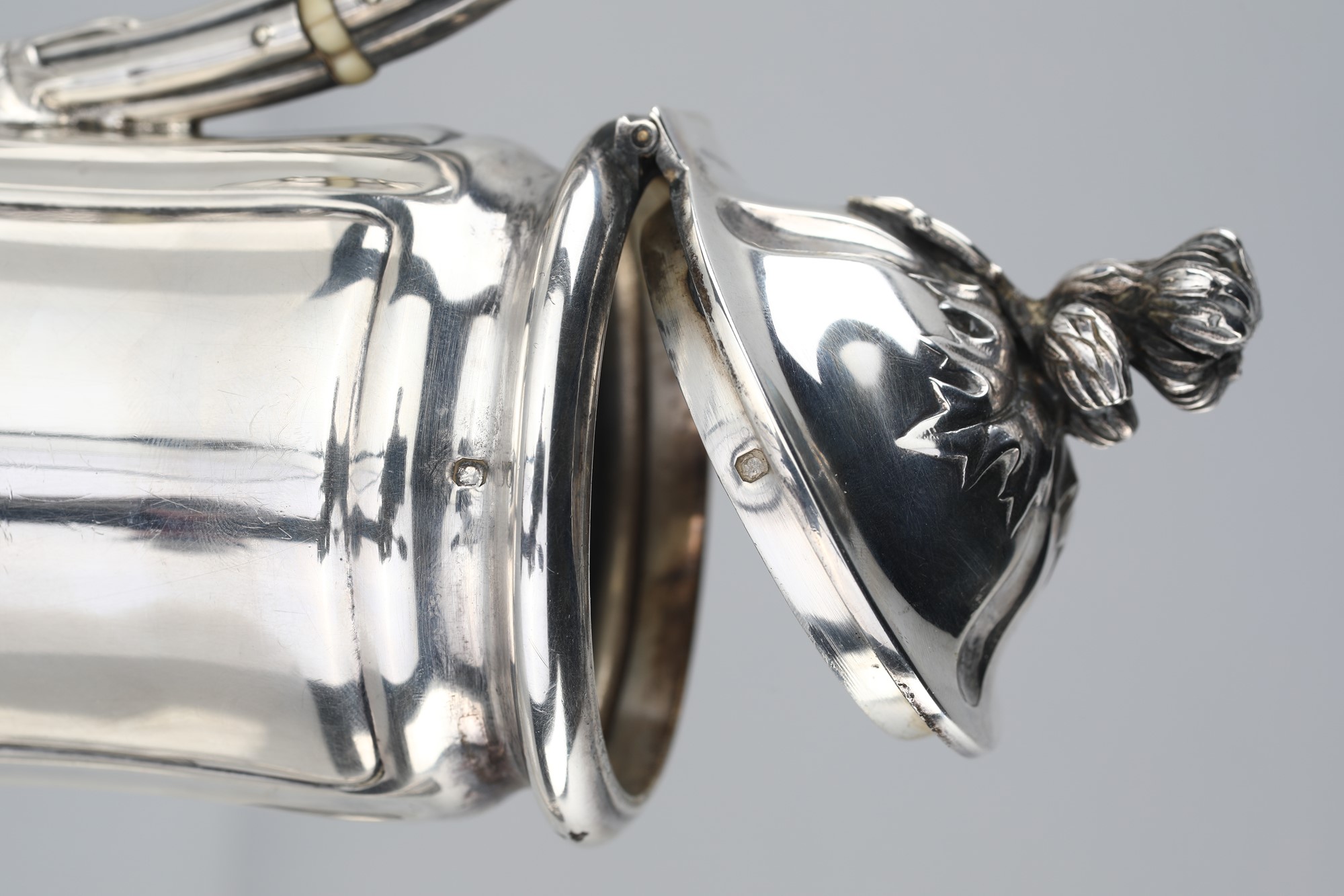 Caffettiera in argento 950/1000, Francia, ultimo quarto XIX secolo - caratterizzata da foglie cesellate disposte all'attaccatura delle varie partizioni; stesso elemento decorativo ripreso a traforo lungo il piede circolare; manico ovale, coperchio a cupolino sormontato da un fiore; monogramma inciso. - altezza cm 24 - gr. 670