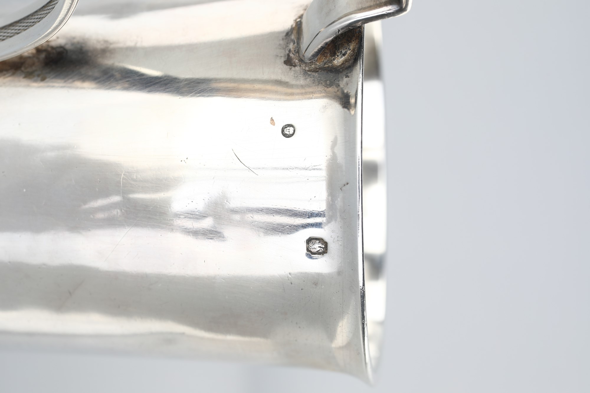 Boccale in argento 950/1000, Parigi 1794 - 1797, argentiere L.J.B. - corpo cilindrico a superficie liscia decorata da monogramma CC entro scudo inciso; manico squadrato impreziosito da una piccola bordura centrale con fitta decorazione a motivi geometrici. - altezza cm 10 - gr. 198