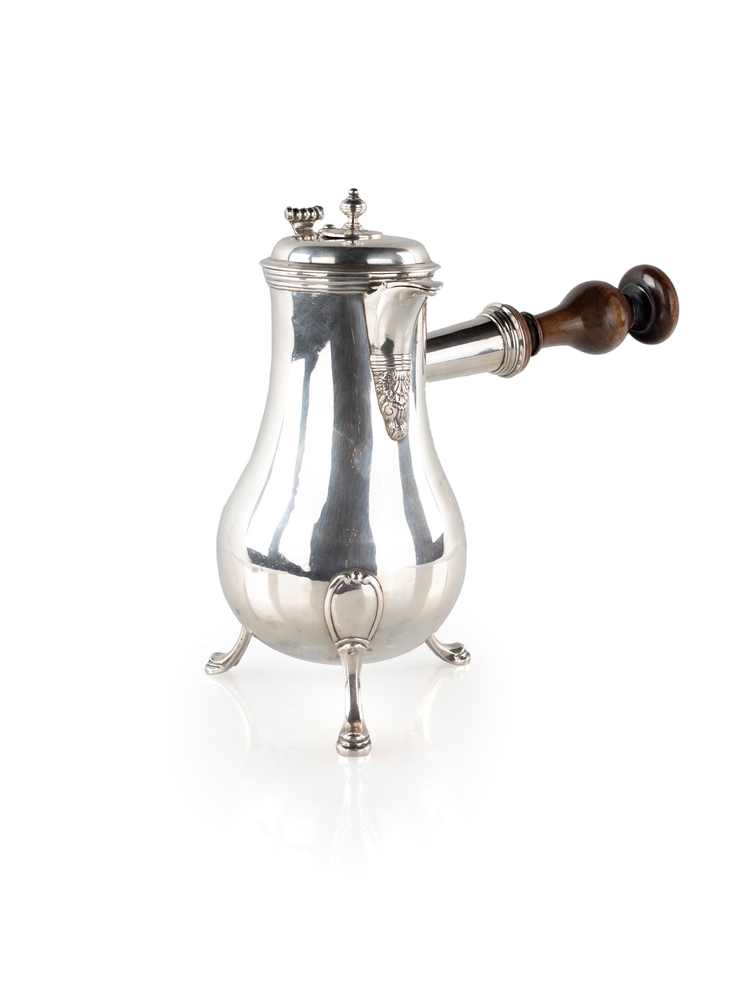 Cioccolatiera in argento, Parigi 1753 - con corpo liscio ornato da monogramma inciso, versatoio aderente, manico traverso in legno removibile, coperchio incernierato con presa a trottola semovibile, tre piedi a biscia. Bolli in uso a Parigi dal 1750 al 1756 (lettera A coronata) e punzone in vigore nel 1753 (lettera N coronata) - altezza cm 27 - gr. 1010