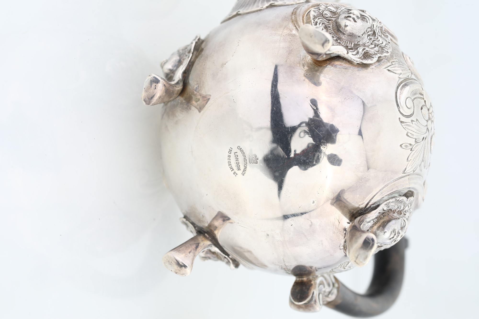 Caffettiera in argento, Londra 1893, argentiere Carrington & C. - interamente decorata a volute e fiori incisi e sbalzati; sorretta da quattro piedini con volti muliebri, reca coperchio incernierato sormontato da un pinnacolo, versatoio sagomato, manico in legno ebanizzato con attacco superiore in forma di mascherone. - altezza cm 19 - gr. 482