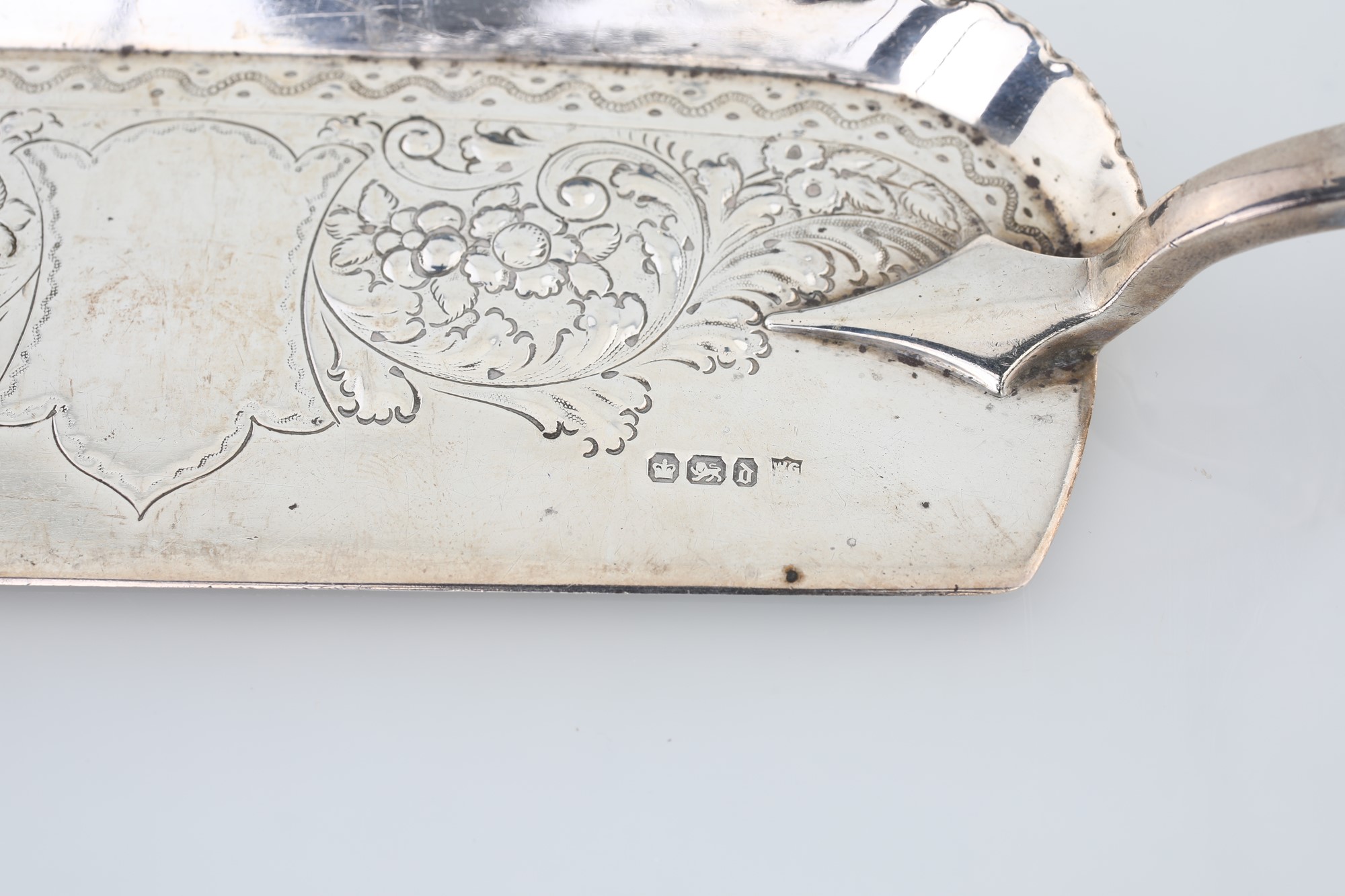 Paletta raccoglibriciole in argento con manico in avorio, Sheffield 1896 - centrata da un cartiglio affiancato da volute vegetali e fiori sbalzati ed incisi - cm 30x6 - peso lordo gr. 190