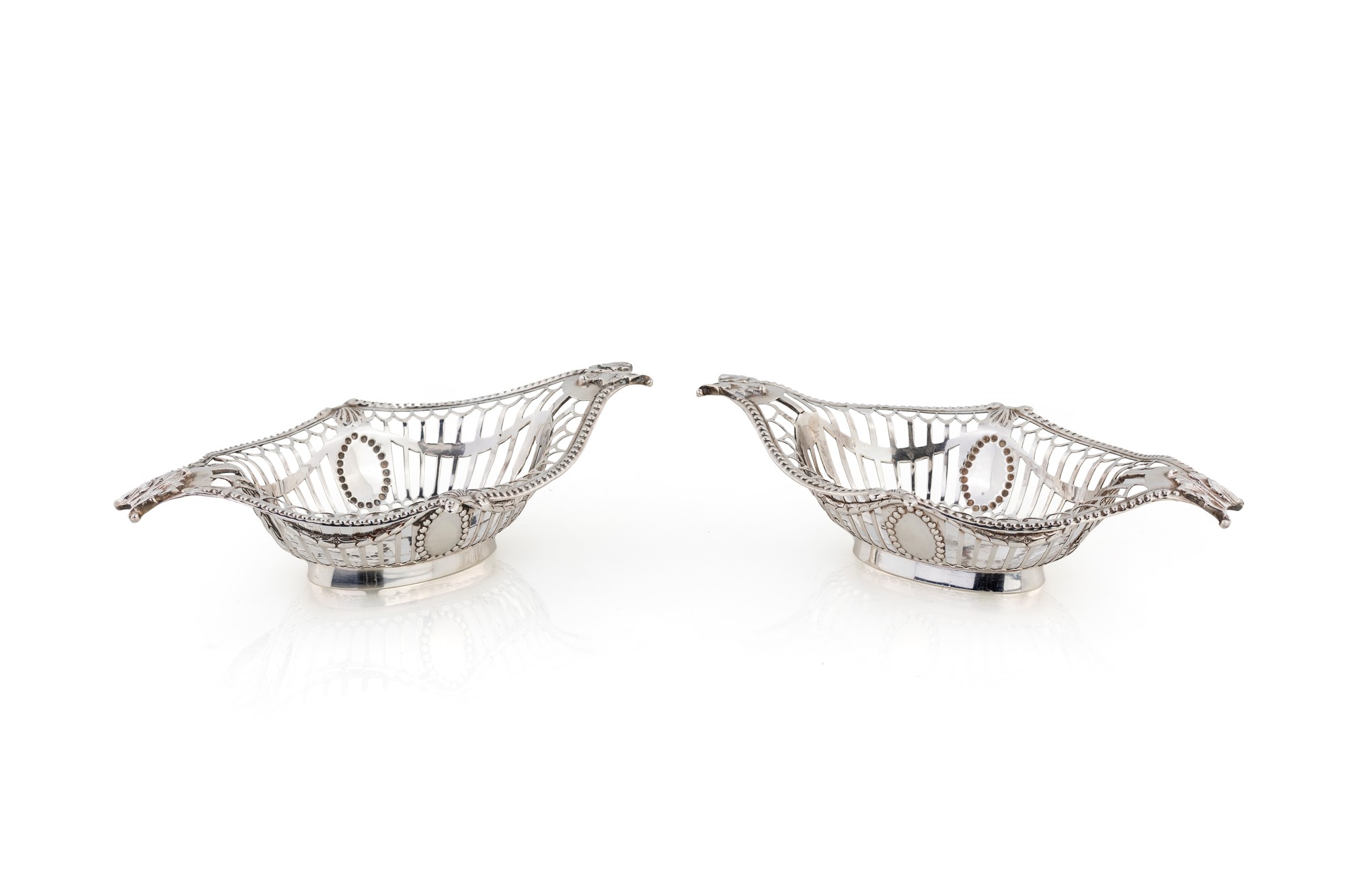 Coppia di cestini in argento 925/1000, Londra 1898 - a forma di navicella con profilo percorso da perline e vertici con rilievi vegetali; su entrambe i fianchi medaglioni ovali a superficie liscia - cm 5x19x10 - gr. 188