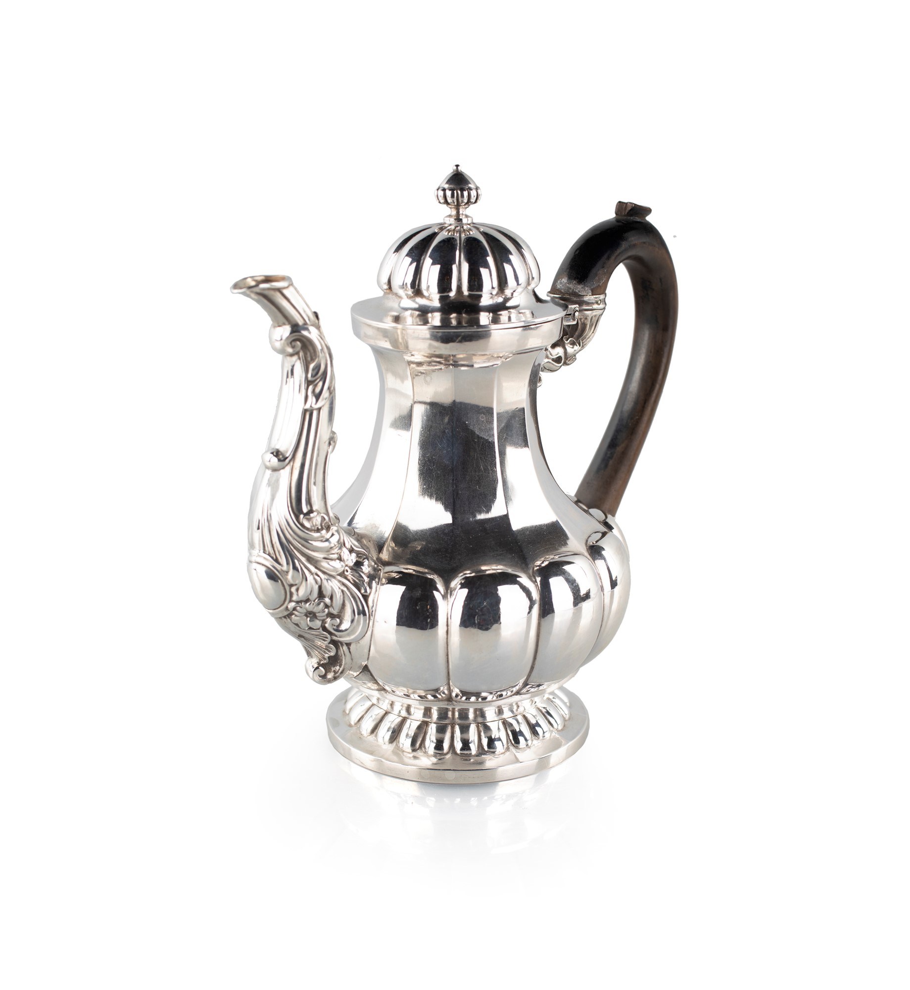 Caffettiera in argento, Regno di Sardegna, zecca di Chambery, 1840 ca. - con corpo caratterizzato da costolature cui corrispondono sbalzi in sequenza lungo la parte inferiore; coperchio a cupolino sormontato da ghianda, versatoio sagomato abbellito da rilievi naturalistici, manico in legno, piede circolare percorso da baccelli. - altezza cm 19 - gr. 475