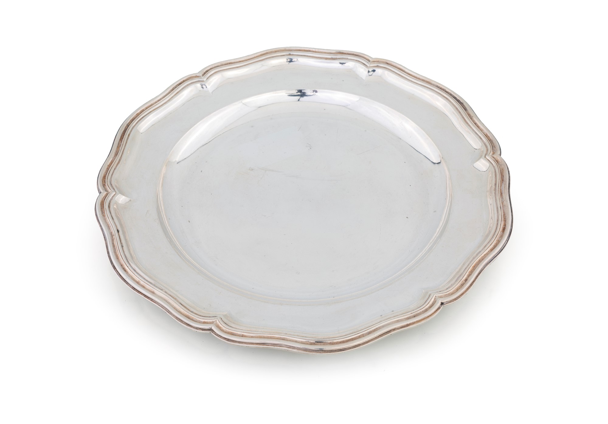 Piatto circolare in argento, Roma Stato Pontificio, argentiere Pietro Paolo Spagna (attivo dal 1817 al 1861) - tesa curvilinea con profilo modanato, en suite col lotto precedentemente descritto - diametro cm 31,5 - gr. 950