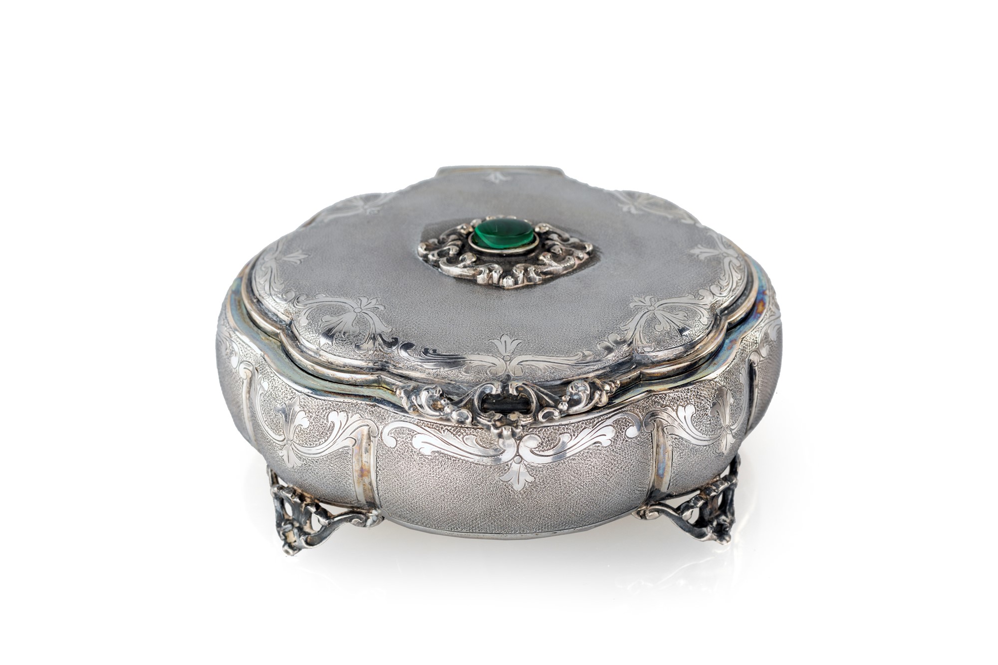 Piccolo portagioie in argento, Milano, 1935/'45 - di forma ovale sagomata sottolineata da volute vegetali incise emergenti dalla superficie puntinata; coperchio incernierato dominato da una gemma cabochon di malachite, piedi a mensola. Bollo fascio. - cm 4,5x11x9 - gr. 224
