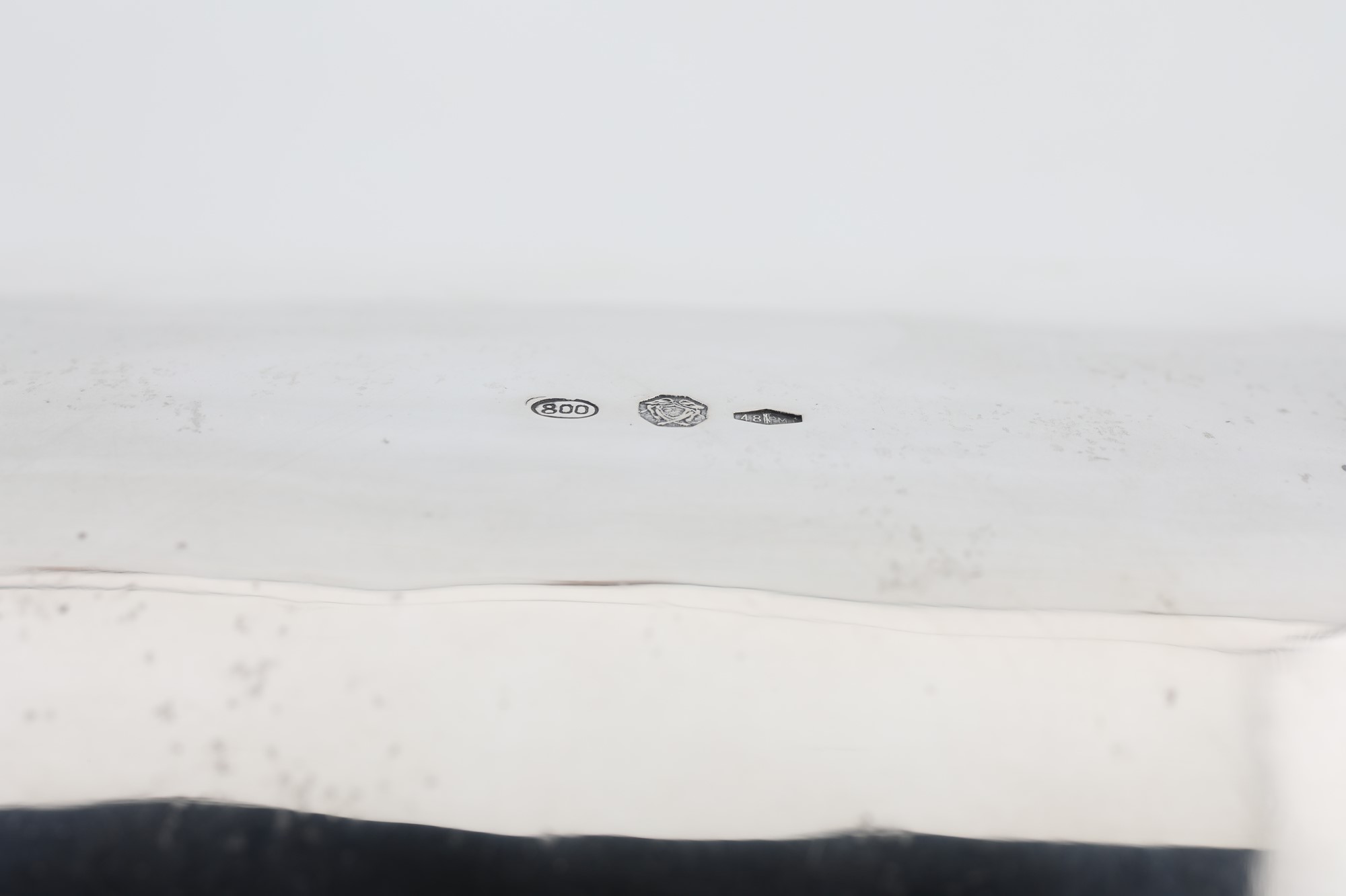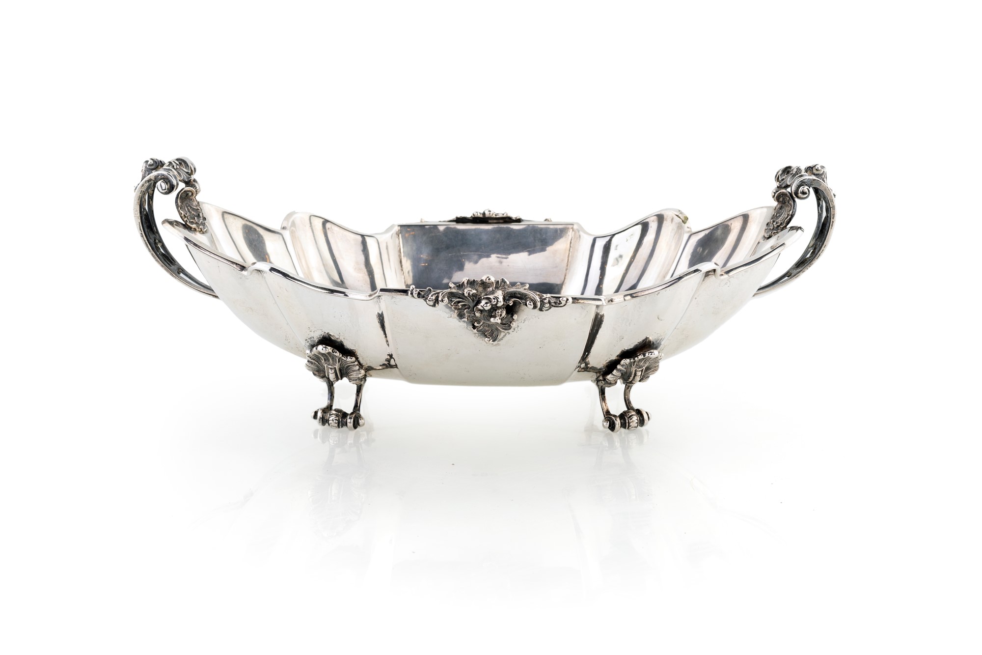 Centrotavola in argento, Milano, 1935/1945 - a forma di navicella con profilo sagomato, manici incurvati e piedi arricchiti da rilievi vegetali - cm 14x38x19 - gr. 1023
