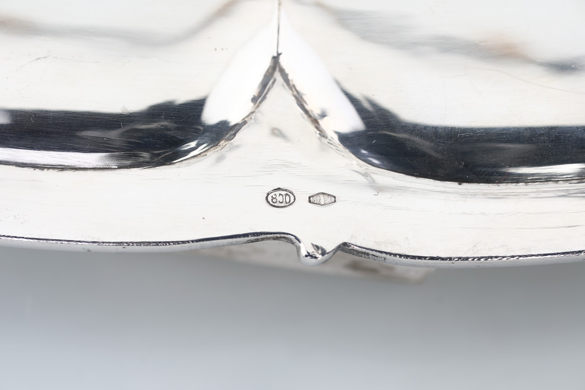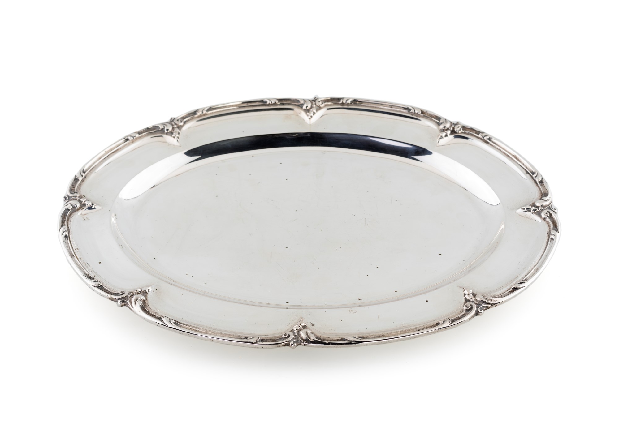 Piatto da portata in argento, Milano, 1935/1945 - di forma ovale con profilo sottolineato da volute vegetali in sequenza; bollo del fascio - cm 40x28 - gr. 842