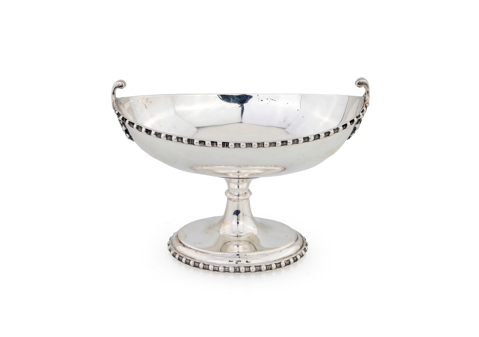 Alzatina in argento, Milano 1935/1945 - di forma ovale con profilo percorso da perline alternate a segmenti, brevi anse ricurve con attacchi cesellati a palmetta - cm 14x19x11,5 - gr. 367