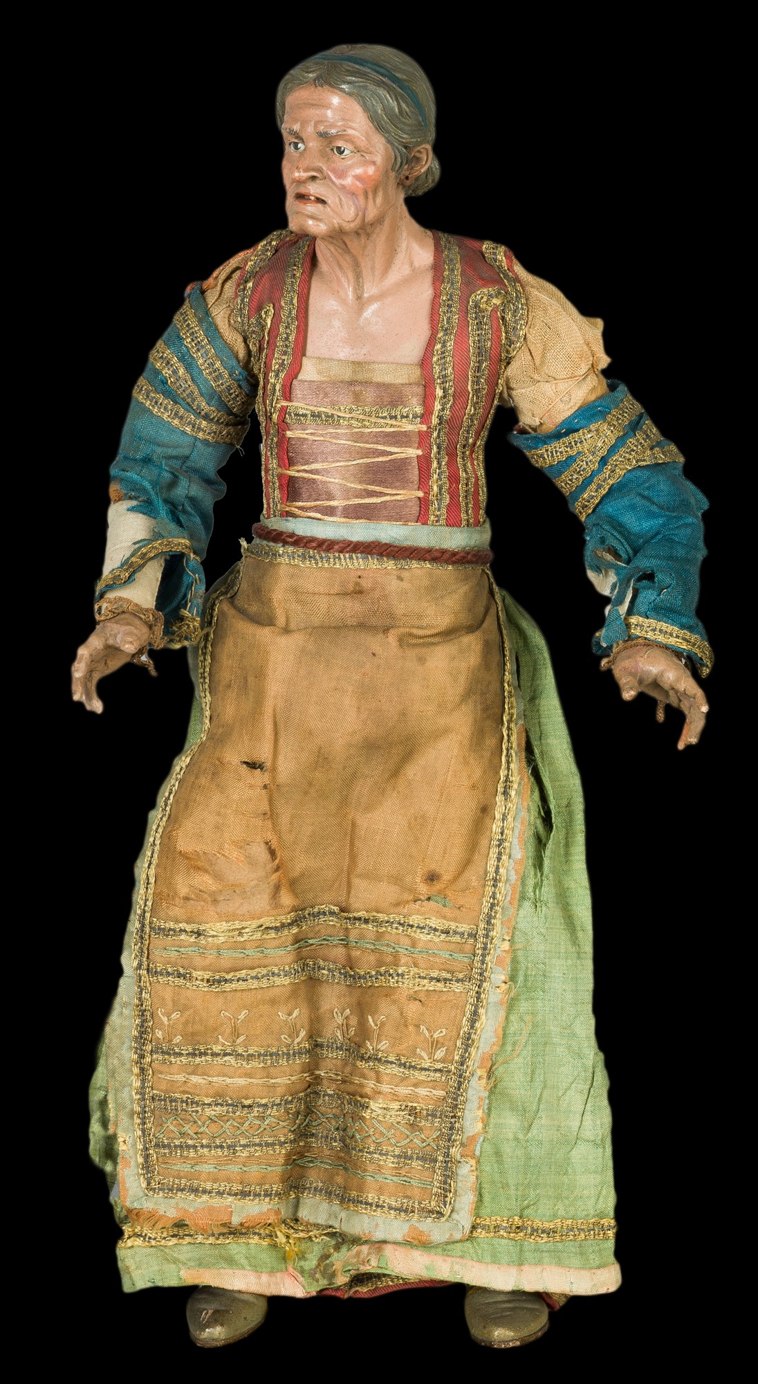 Vecchia popolana con chignon - corpetto rosso e beige a strisce, maniche blu con gallonature orizzontali, gonna verde, sinale ampio di colore beige, pantofole ai piedi. - altezza cm 29