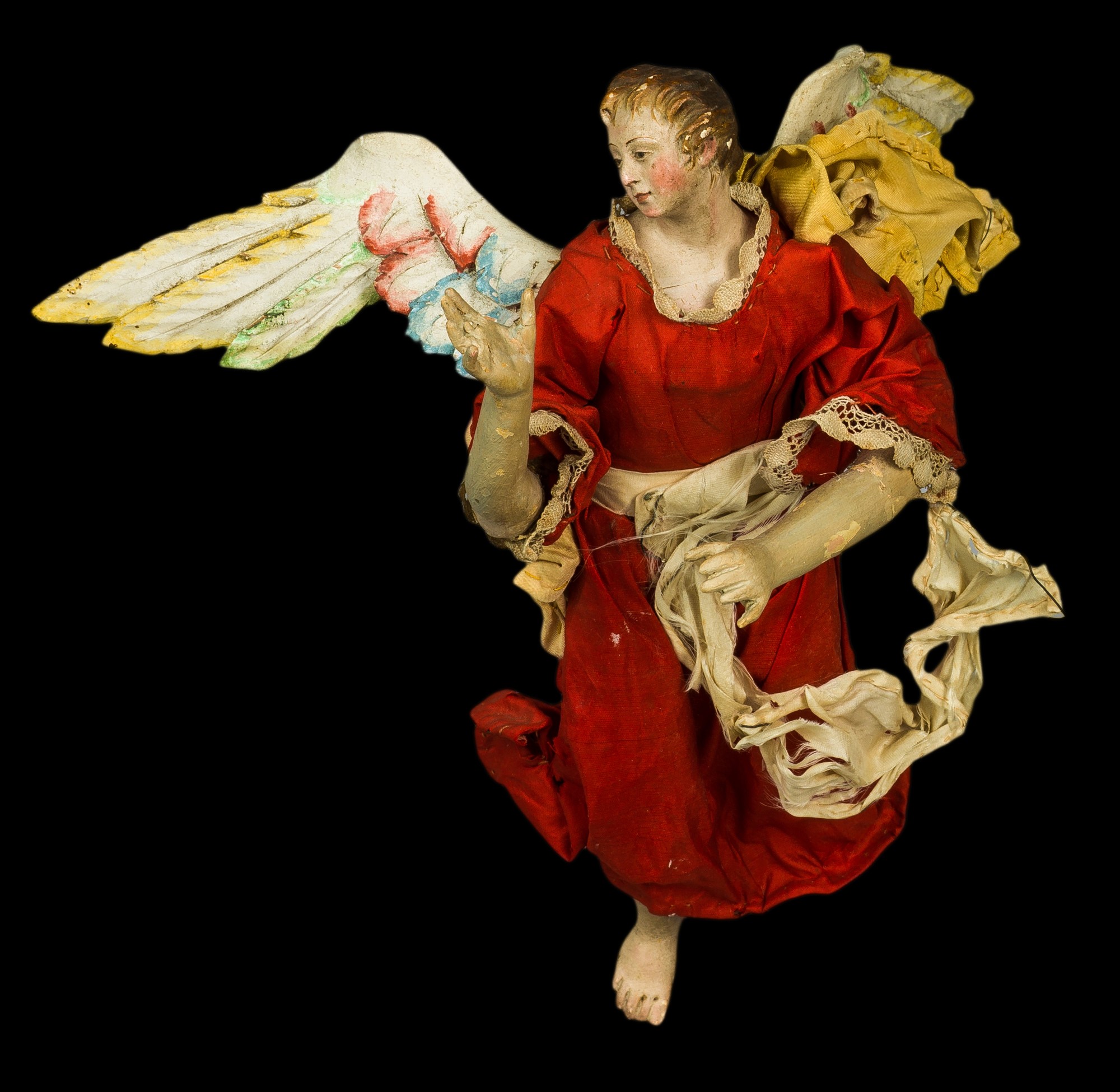Angelo vestito - ali in legno policromo, tunica rossa, svolazzi gialli e bianchi. Lievi difetti. - altezza cm 22