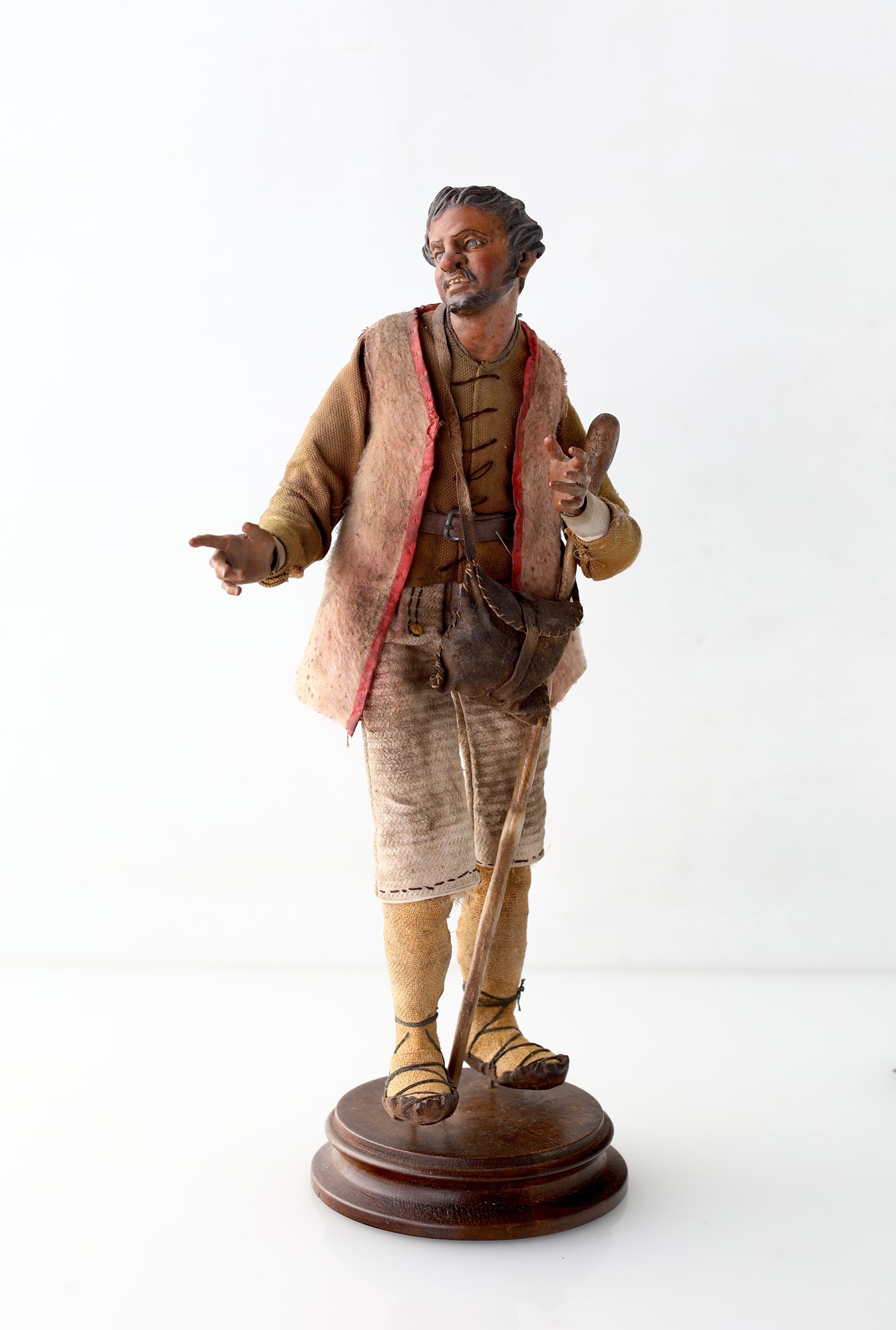 Francesco Celebrano (attribuito) - Viandante - Panciotto beige con cinta, lungo gilet bordato di rosso, pantaloni di tela beige, cioce ai piedi. Accessori: borsa in pelle a tracolla, bastone in legno. - altezza cm 37