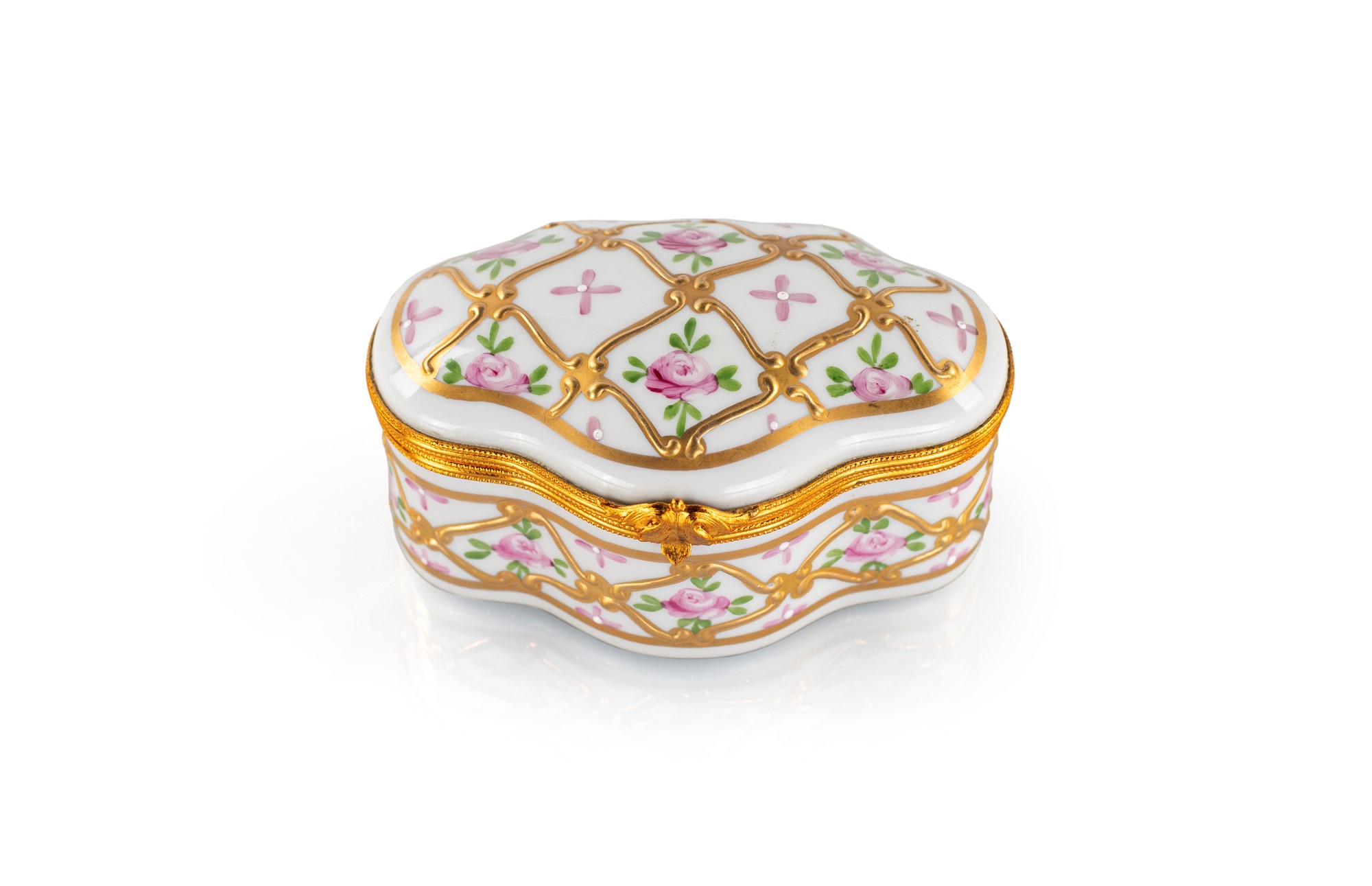 Tabacchiera in porcellana bianca e oro, Limoges, Francia, XX secolo - di forma sagomata decorata da grillage in oro centrato da rose; finitura in metallo dorato. - cm 4x9x5,5