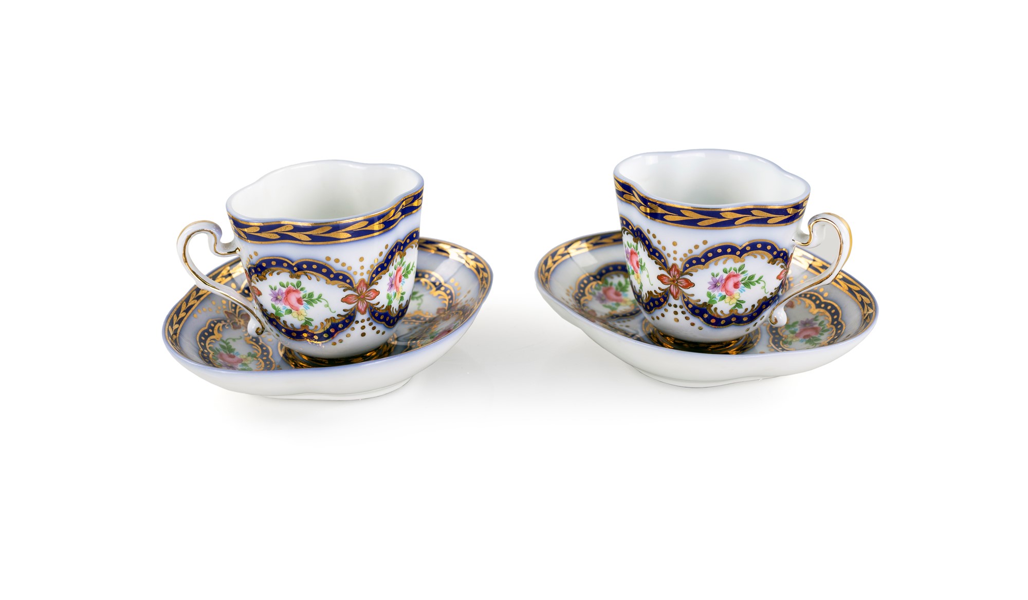 Coppia di tazzine da caffè in porcellana policroma, XX secolo - di forma ovale lobata, decorate da composizioni floreali entro riserve delineate in blu e oro - cm 6x8,5x5,5 - piattino cm 12x10