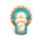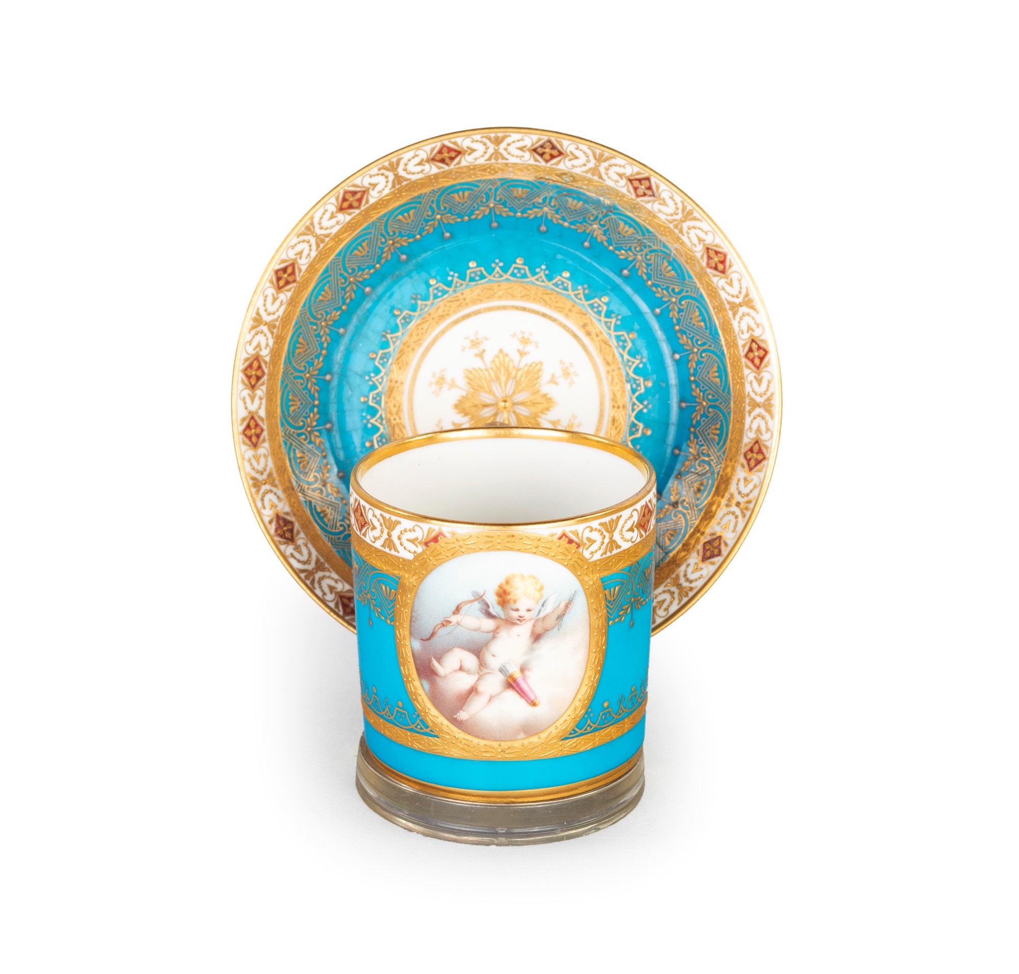 Tazzina con piattino in porcellana, Minton, Inghilterra, metà del XIX secolo - decorata in oro su fondo turchese; di forma cilindrica, reca medaglione ovale con figura di Cupido. - cm 6,5x9x6 - piattino diametro cm 13,5