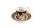 Tazza da tè in porcellana policroma, Ginori, inizio XX secolo - decorata in vivace policromia con figure mitologiche - cm 7x11x8,5 - piattino diametro cm 15