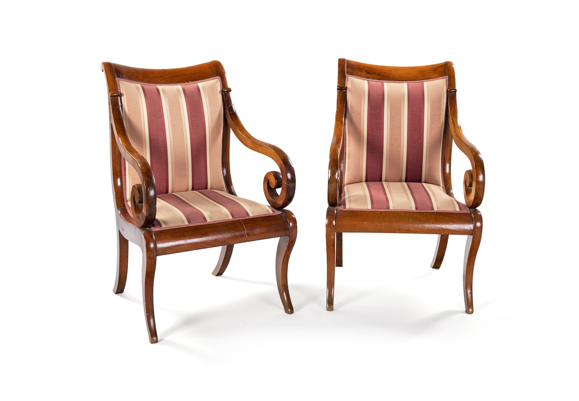 Coppia di poltrone in ciliegio, XIX secolo - con schienale e sedile imbottiti rivestiti in tessuto a righe; braccioli incurvati e gambe lievemente sagomate. - cm 90x54x60