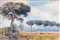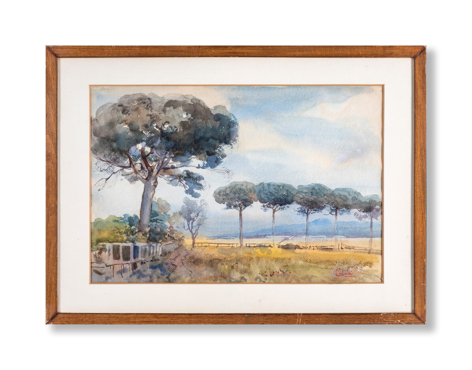 Onorato Carlandi - Paesaggio con filare di pini - Firmato in basso a destra: O. Carlandi - acquerelli su carta - cm 34x50