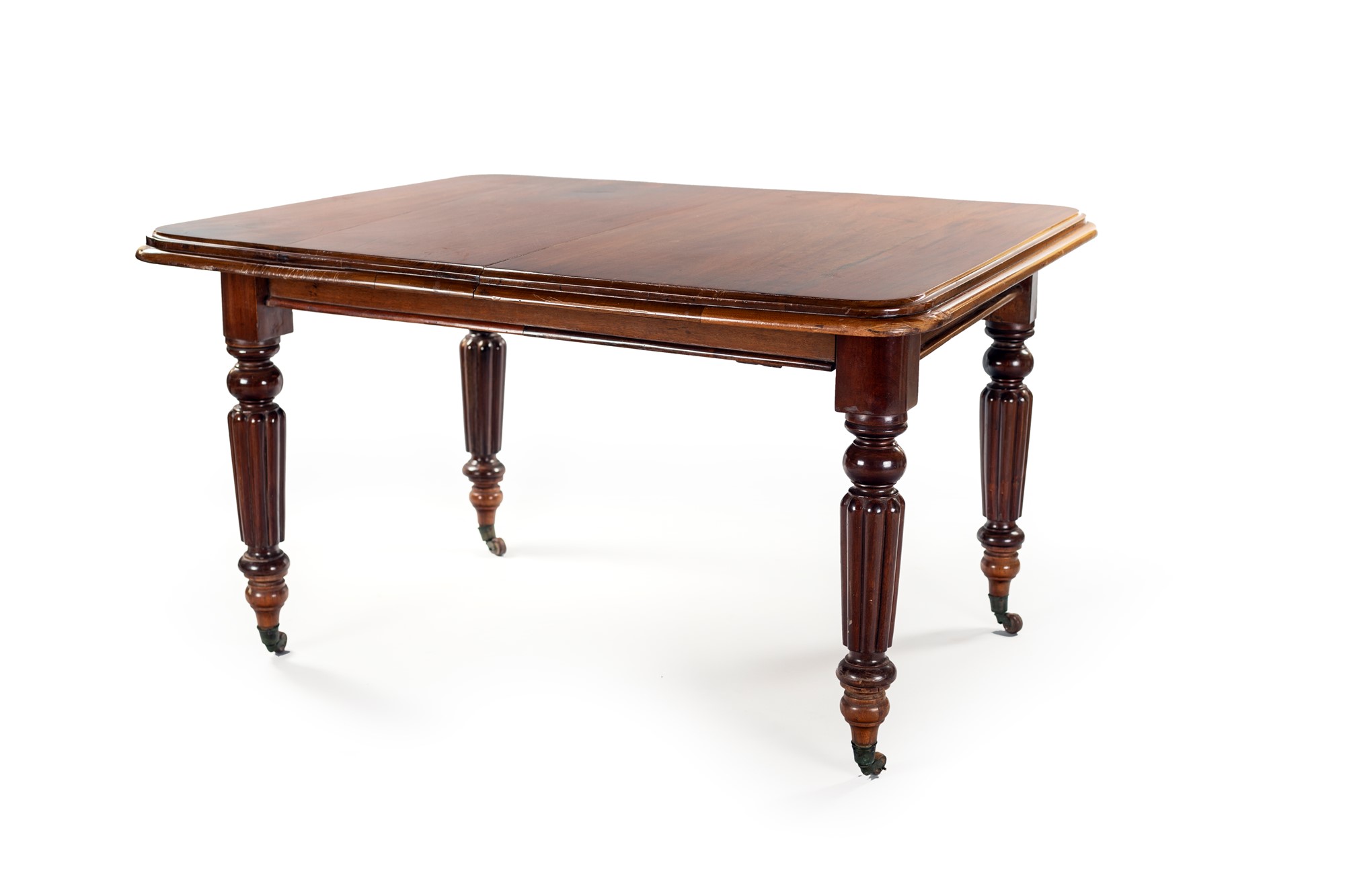 Tavolo in mogano allungabile, Inghilterra XIX secolo - con piano rettangolare ad angoli arrotondati, gambe rastremate percorse da nervature, con estremità tornite e attacchi a dado; poggiante su ruote. - cm 77x130x120 + prolunga cm 60