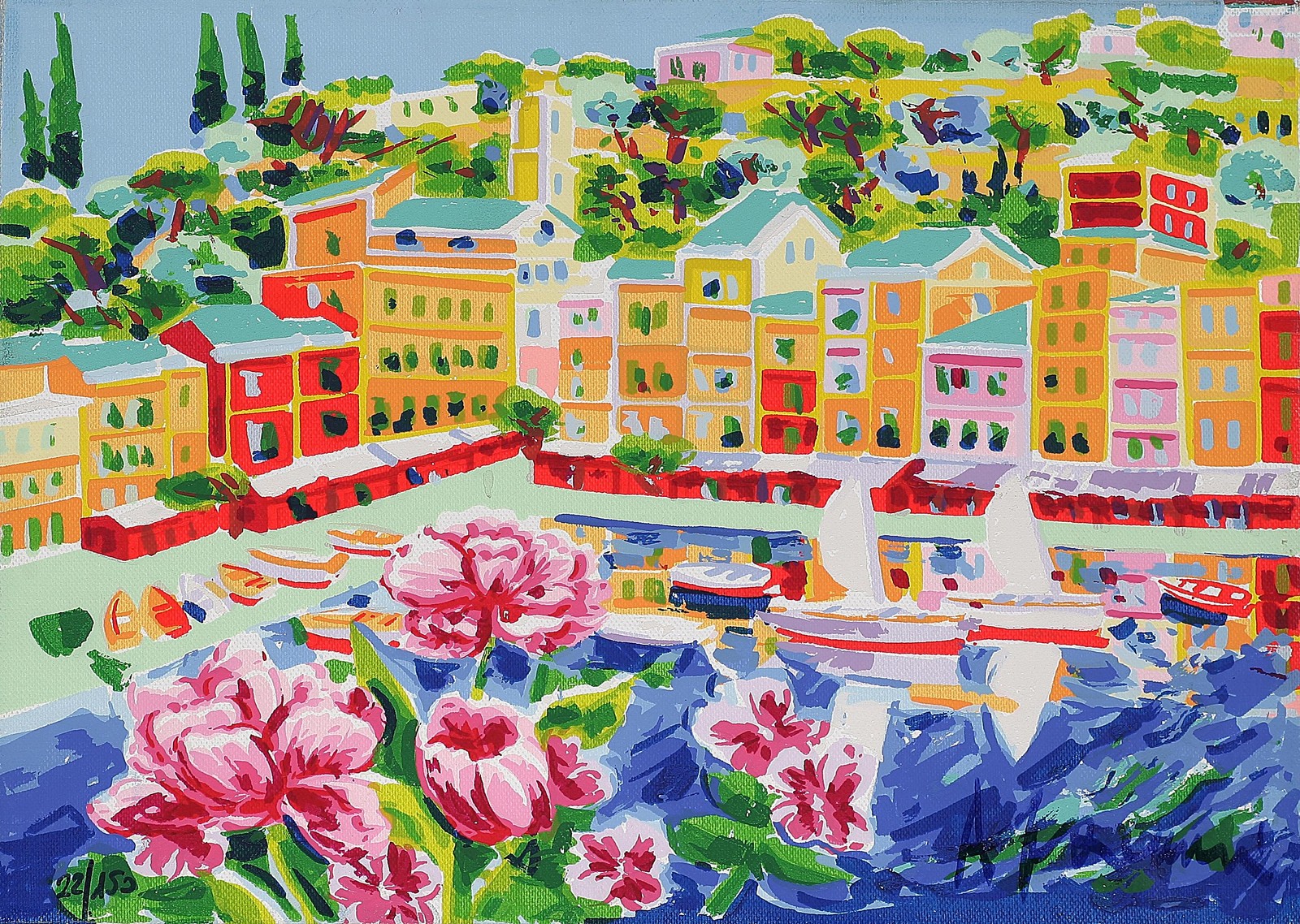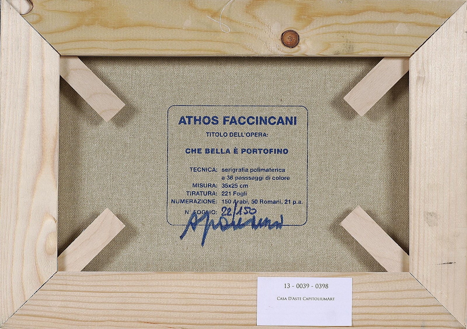 FACCINCANI ATHOS (n. 1951) Che bella è Portofino. Serigrafia su tela. Cm 35,00 x 25,00. Edizione 150+ L+21 P.A. Esemplare: 22. Firma al retro.