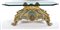 Tavolino da salotto in legno laccato verde e oro - costituito da una base in forma di mensolone architettonico con profili sottolineati da serti intagliati; piedi a ricciolo. Piano rettangolare in cristallo con profili scantonati - cm 42x105x60
