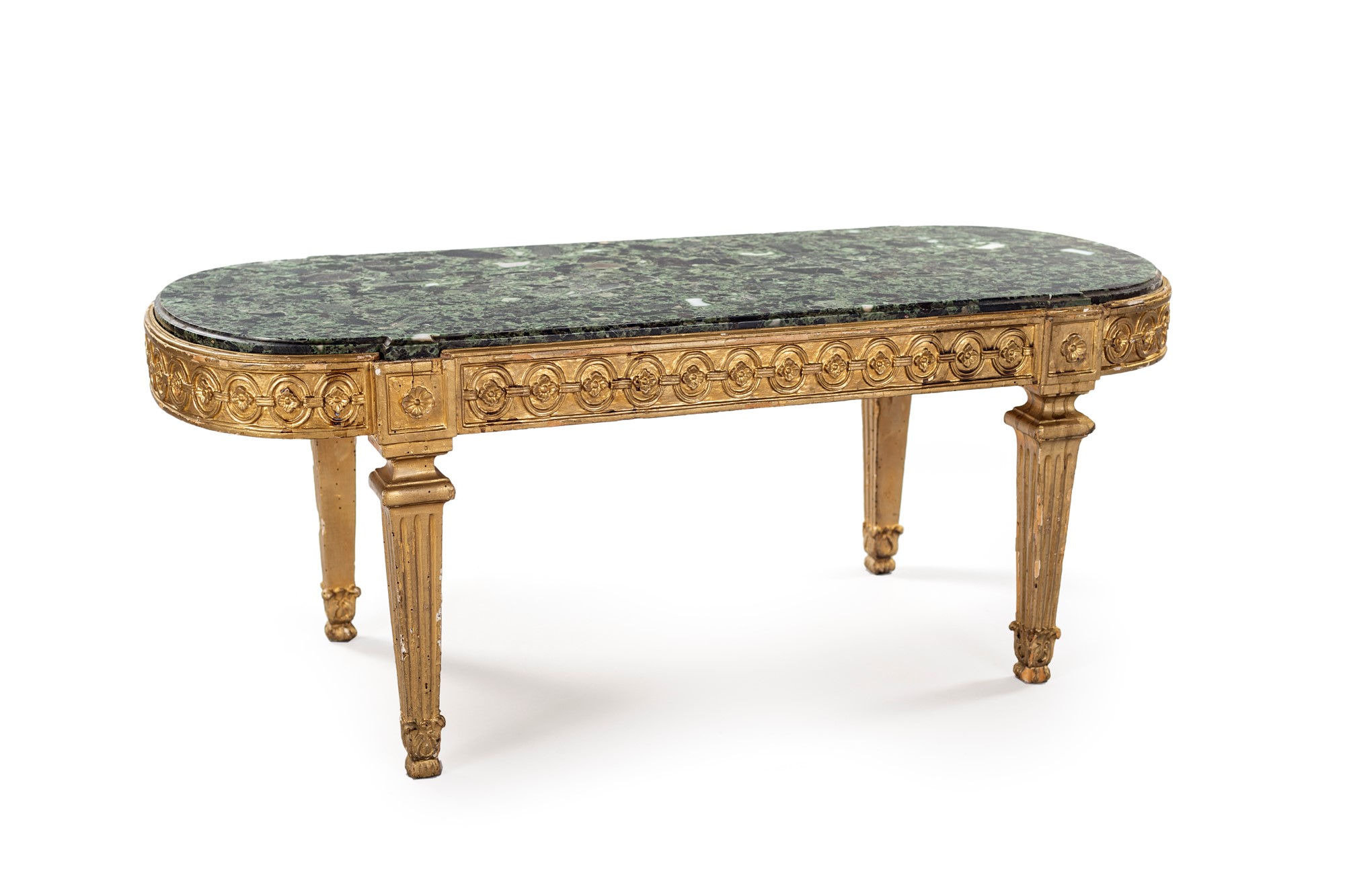 Tavolino basso in legno dorato - con piano ovale in marmo verde, fascia percorsa da corolle entro cerchi in sequenza, gambe rastremate scanalate. - cm 48x120x50