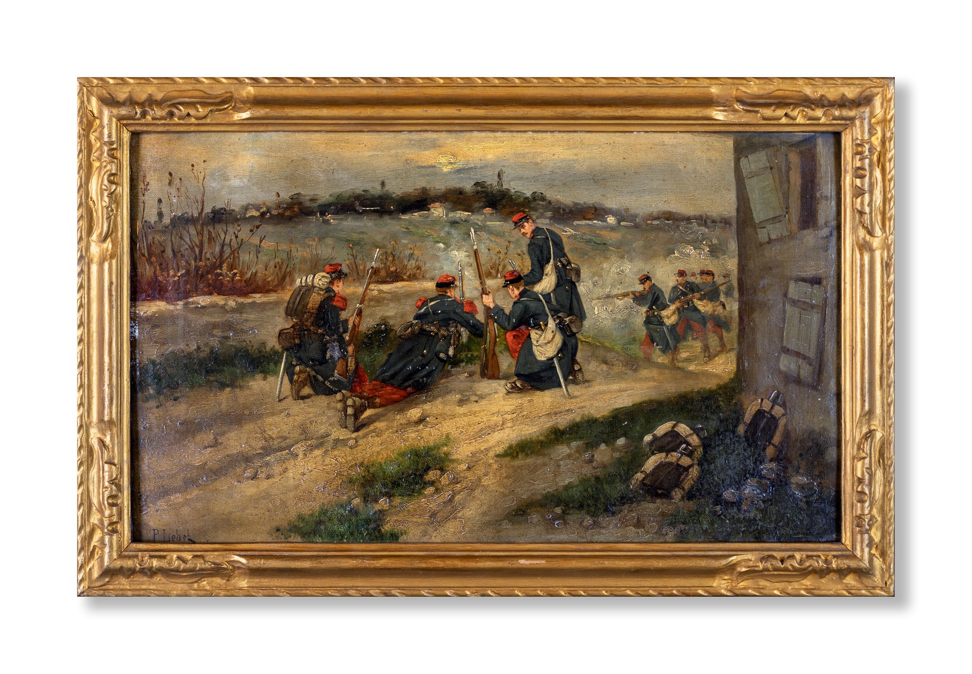 Scuola francese del XIX secolo - Soldati francesi pronti all'attacco - Firmato in basso a sinistra: J. Liebel - olio su tela applicata su cartone - cm 37x63