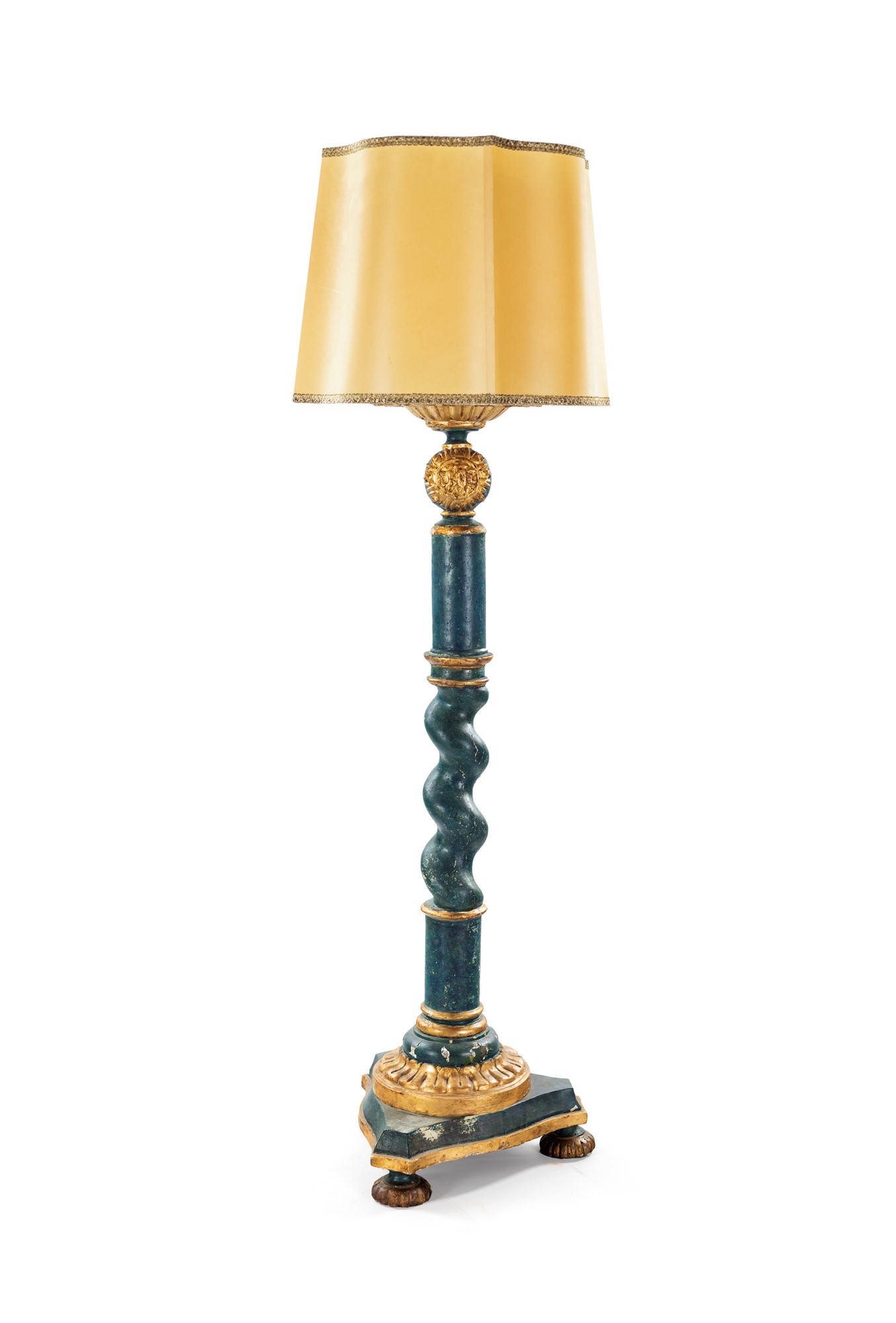 Antica torciera in legno laccato azzurro e oro - con alto fusto in parte liscio e tortile, sormontato da bulbo dorato con piattello intagliato; base trilobata su piedi a plinto. Completa di paralume. - cm 140x40