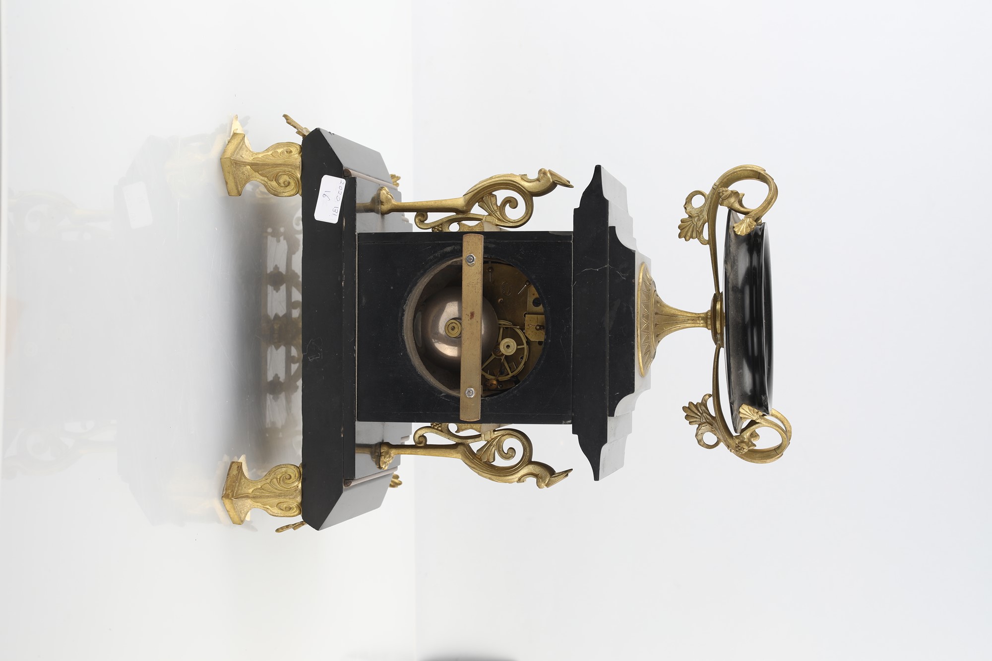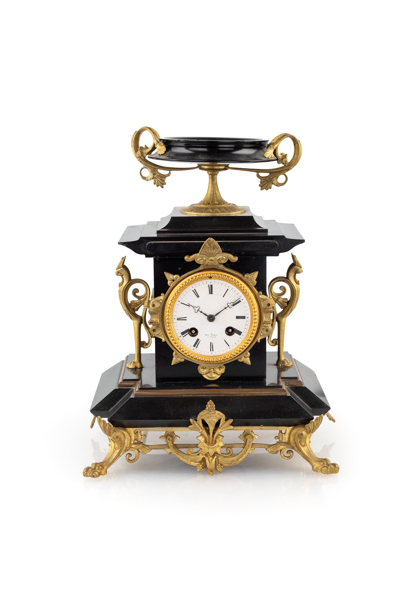 Orologio in marmo nero e bronzo, Henry Marc, Parigi, seconda metà XIX secolo - con cassa squadrata impreziosita da finiture in bronzo dorato, sormontata da una coppa; quadrante circolare in smalto bianco a due fori di carica e fascia oraria a numeri romani, firmato H.ry Marc à Paris. - cm 33x25x19
