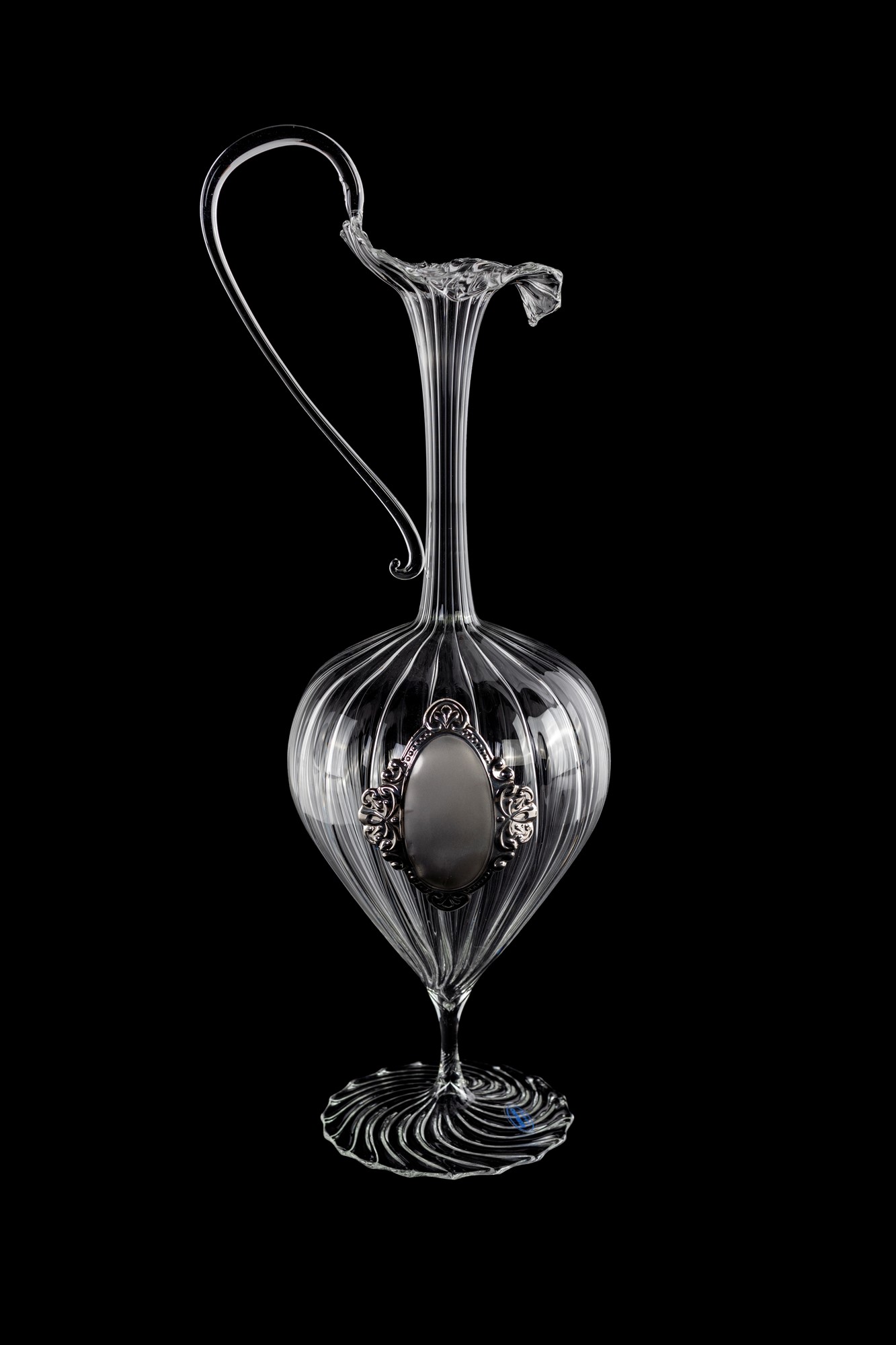 Brocca in vetro soffiato, Murano - di forma sagomata su piede circolare, interamente percorsa da scanalature elicoidali e decorata da un cartiglio in argento - altezza cm 45