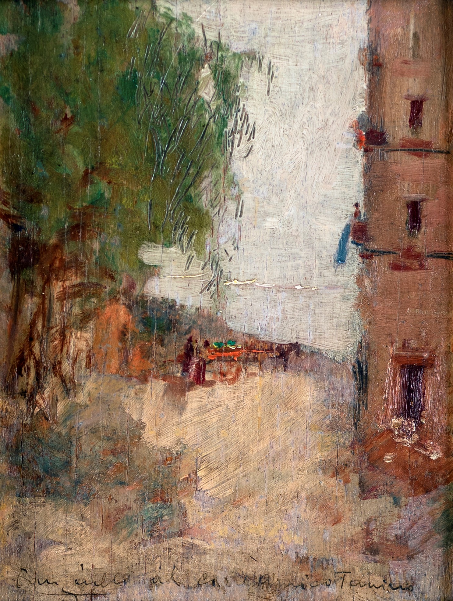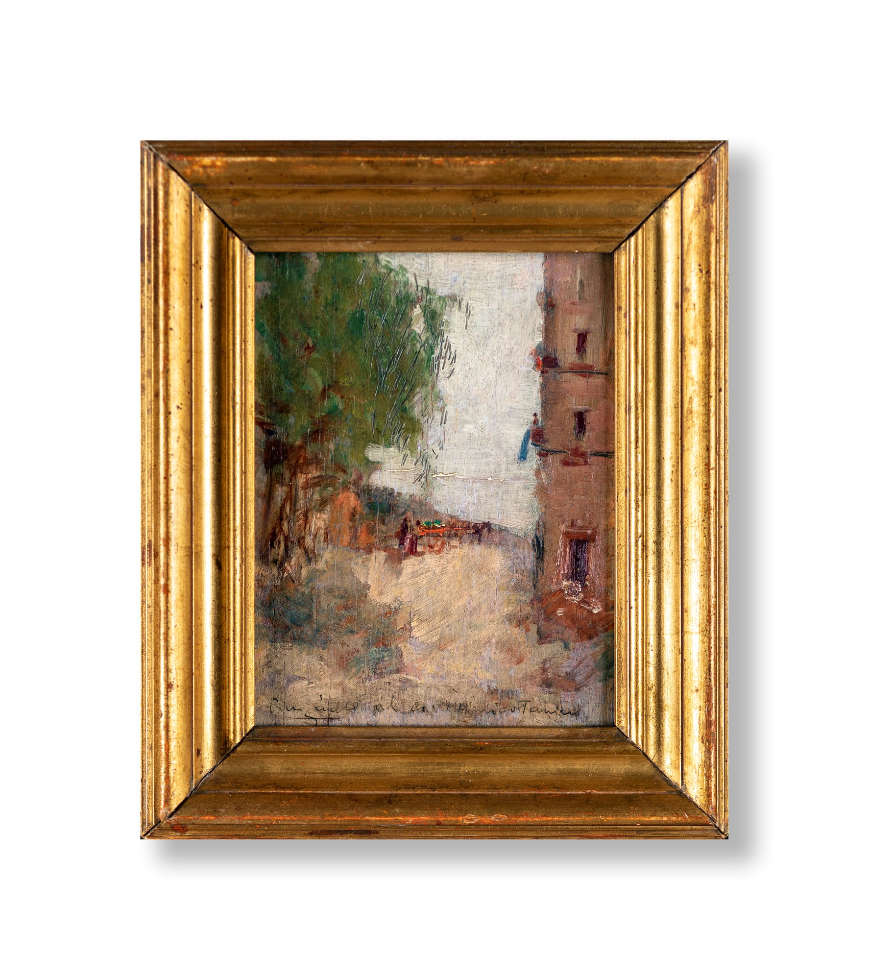 Francesco Cangiullo - Paesaggio cittadino - Firma e dedica sul fronte in basso - Olio su tavola - 16,5x12