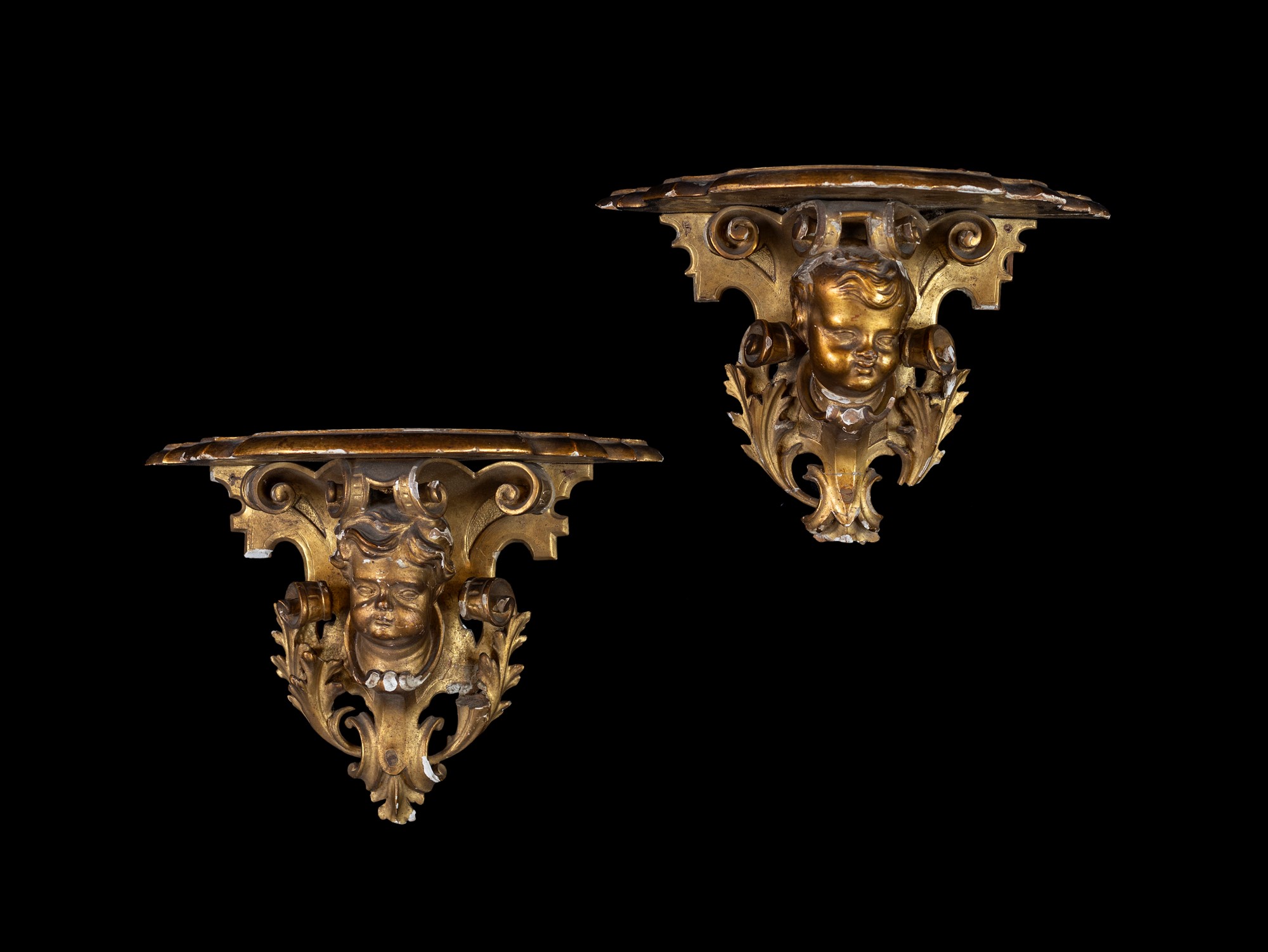 Coppia di mensoline in legno dorato, XIX secolo - con piano sagomato sorretto da un cartiglio centrato da volto di cherubino - cm 22x32x13
