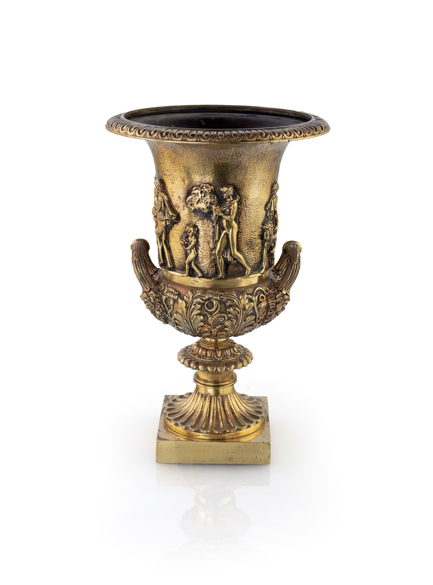 Vaso Medici in bronzo dorato - decorato a tutto tondo con figure in bassorilievo - cm 37x23
