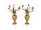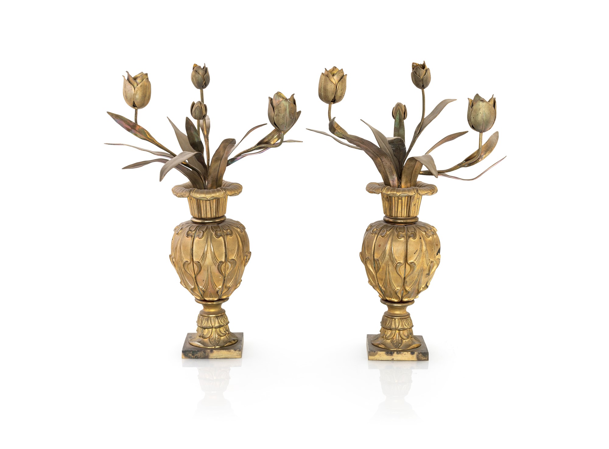 Coppia di candelabri in bronzo dorato a due luci, XIX secolo - in forma di vaso ad anfora ricolmo di fiori - cm 43x27