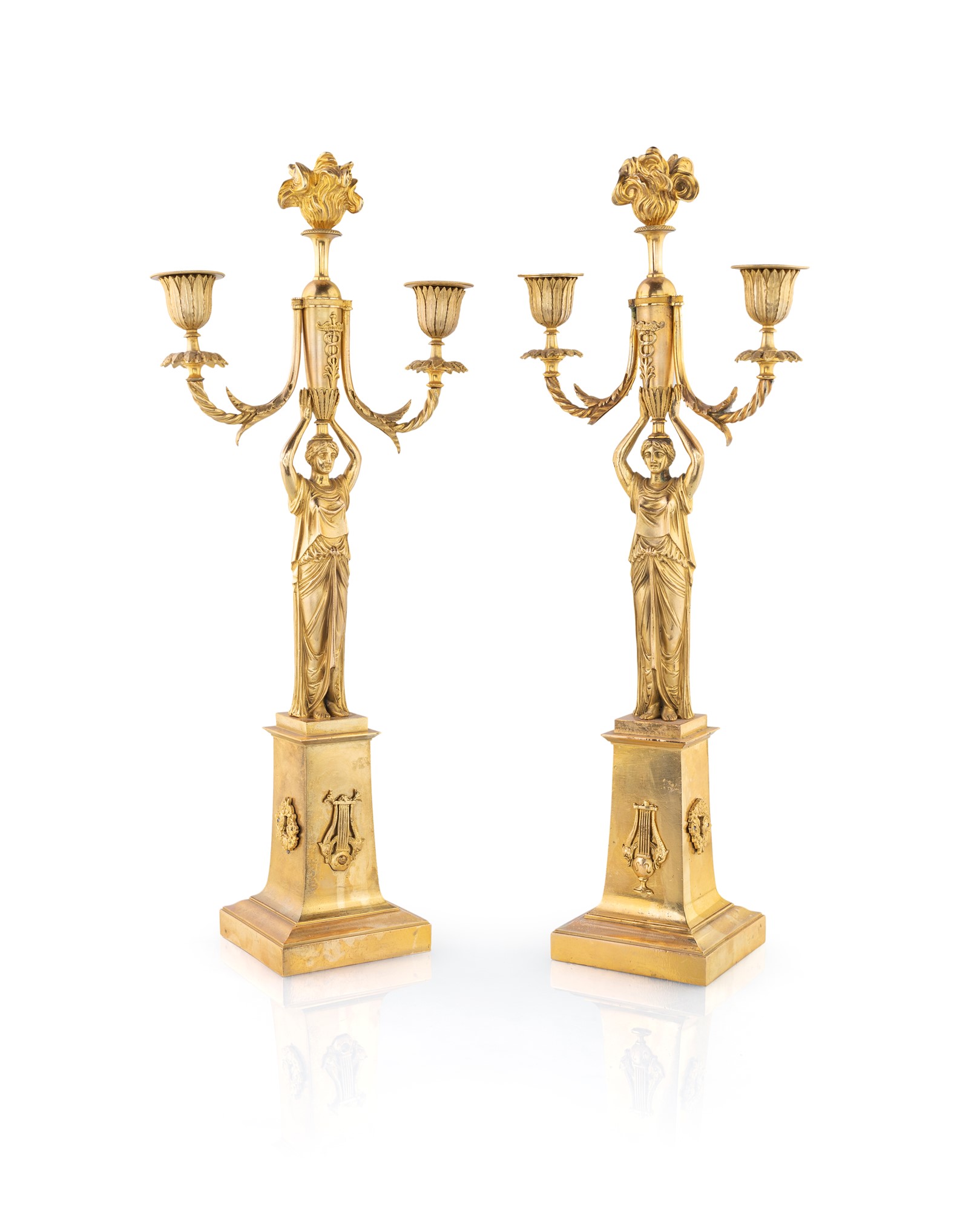 Coppia di candelieri in bronzo dorato di gusto Impero - a tre luci sorrette...