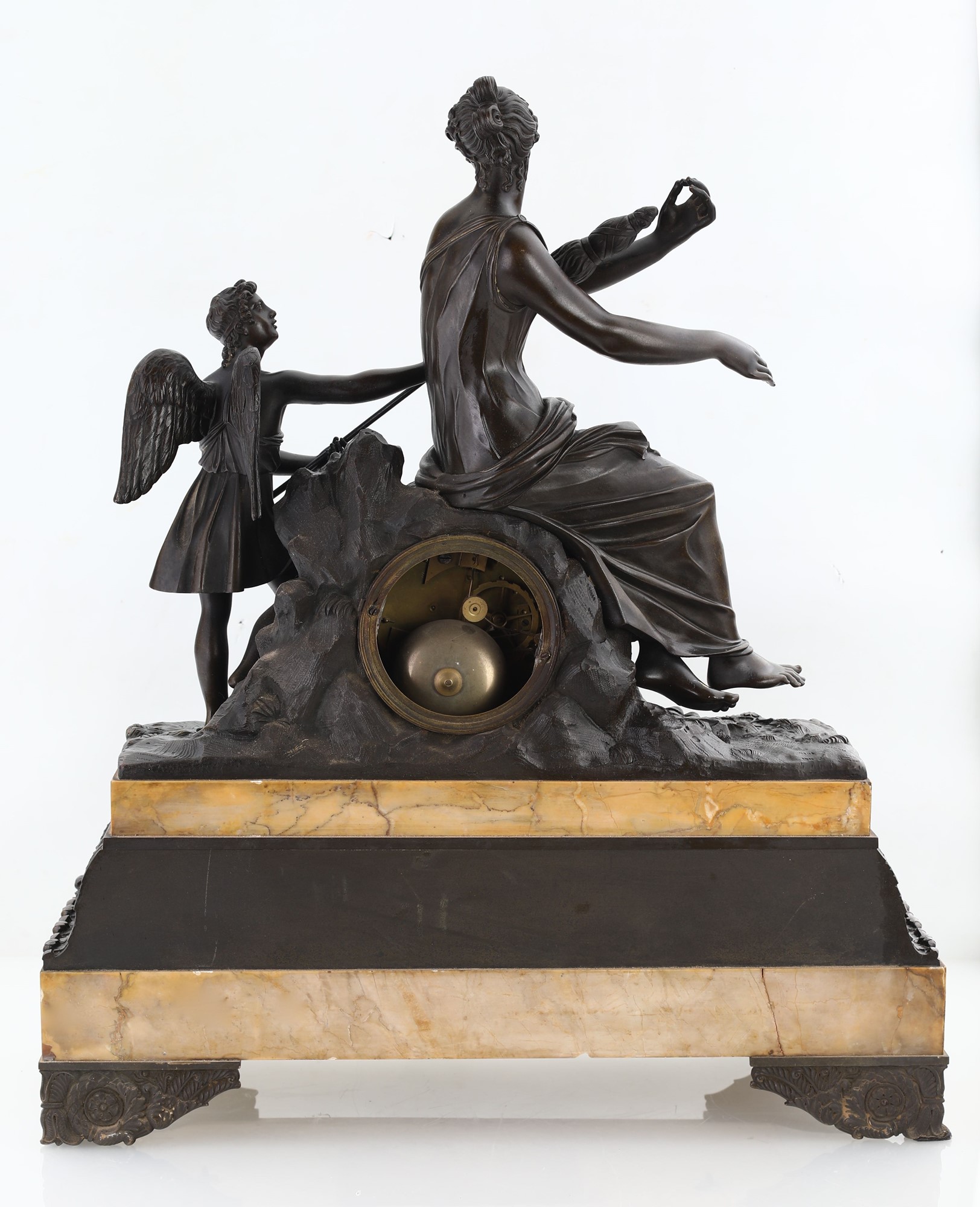 Grande orologio da camino in bronzo brunito, XIX secolo - caratterizzato dalle figure di Venere e Cupido. Quadrante circolare a due fori di carica e fascia oraria a numeri romani, base in marmo giallo  - cm 63x54x19,5