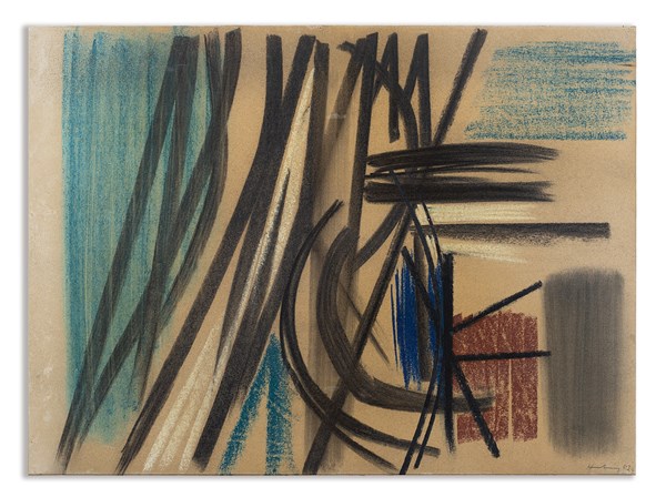 Hans Hartung "Senza titolo" 1953 pastelli su carta applicata su cartoncino cm 48