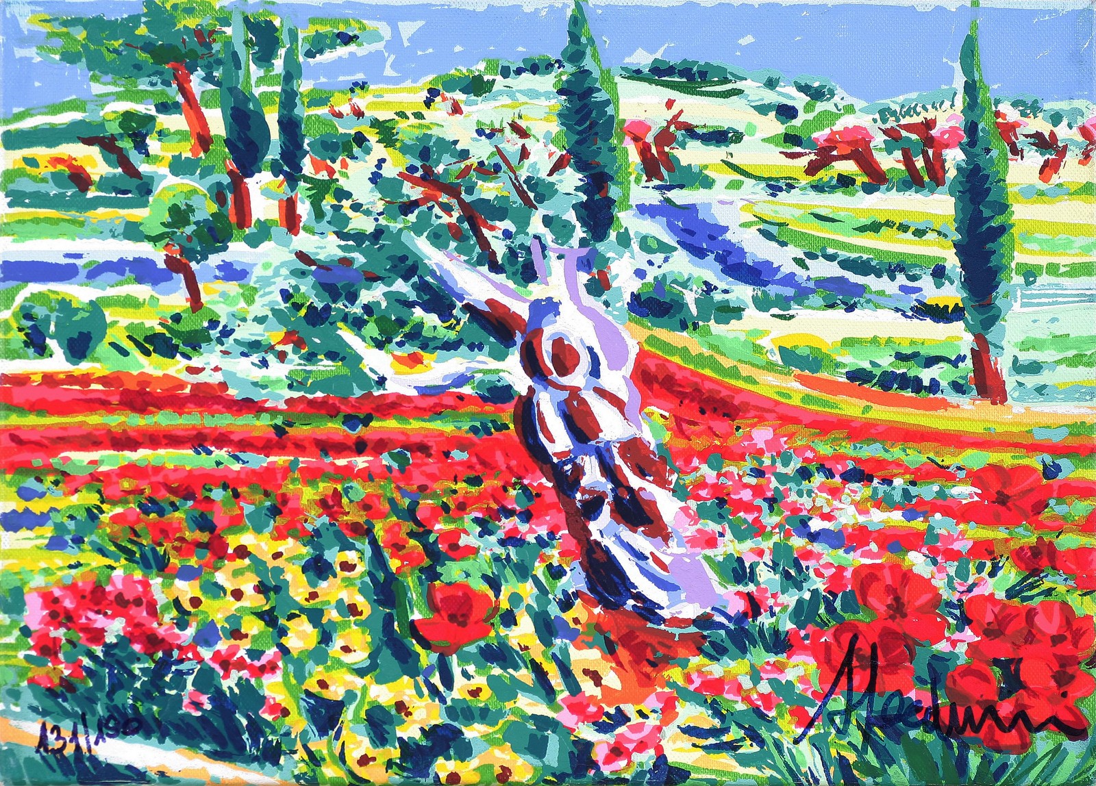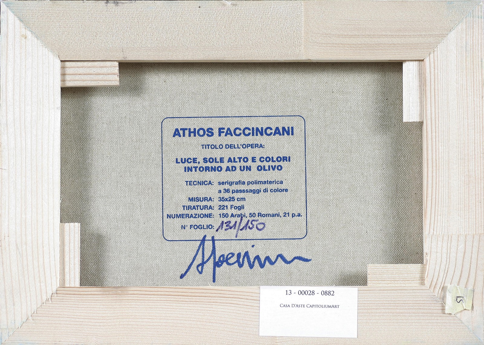 FACCINCANI ATHOS (n. 1951) Luce, sole alto e colori intorno ad un olivo. Serigrafia polimaterica. Cm 25,00 x 35,00. Al retro titol, tecnica, tiratura e firma. Tir. 131/150 in basso a sinistra. Firma in basso a destra.