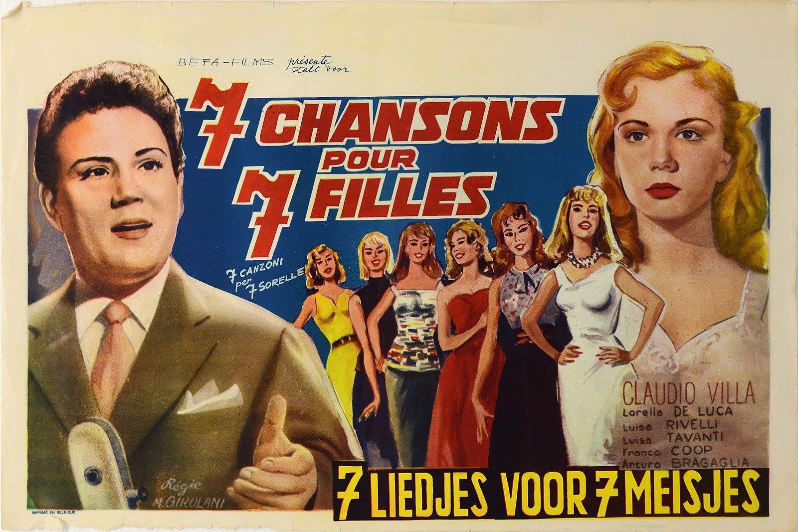 GIROLAMI MARINO (1914 - 1994) 7 canzoni per 7 sorelle. (7 chansons pour 7 filles). 1956. Poster. Cm 53,00 x 35,00. Poster vintage originale cinematografico. Edizione belga. Condizione A meno.