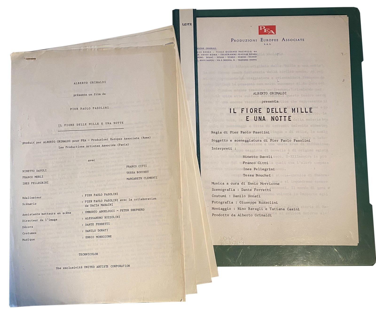 PIER PAOLO PASOLINI (1922 - 1975) Il Fiore delle Mille e Una Notte. 1974. comunicato stampa / sceneggiatura. Cm 20,00 x 30,00. Ciclostile originale vintage della sceneggiatura e comunicato stampa dell'opera, 1 copia edizione italiana e 1 copia edizione francese. PEA e Productions Artistes Associés. Condizione A.