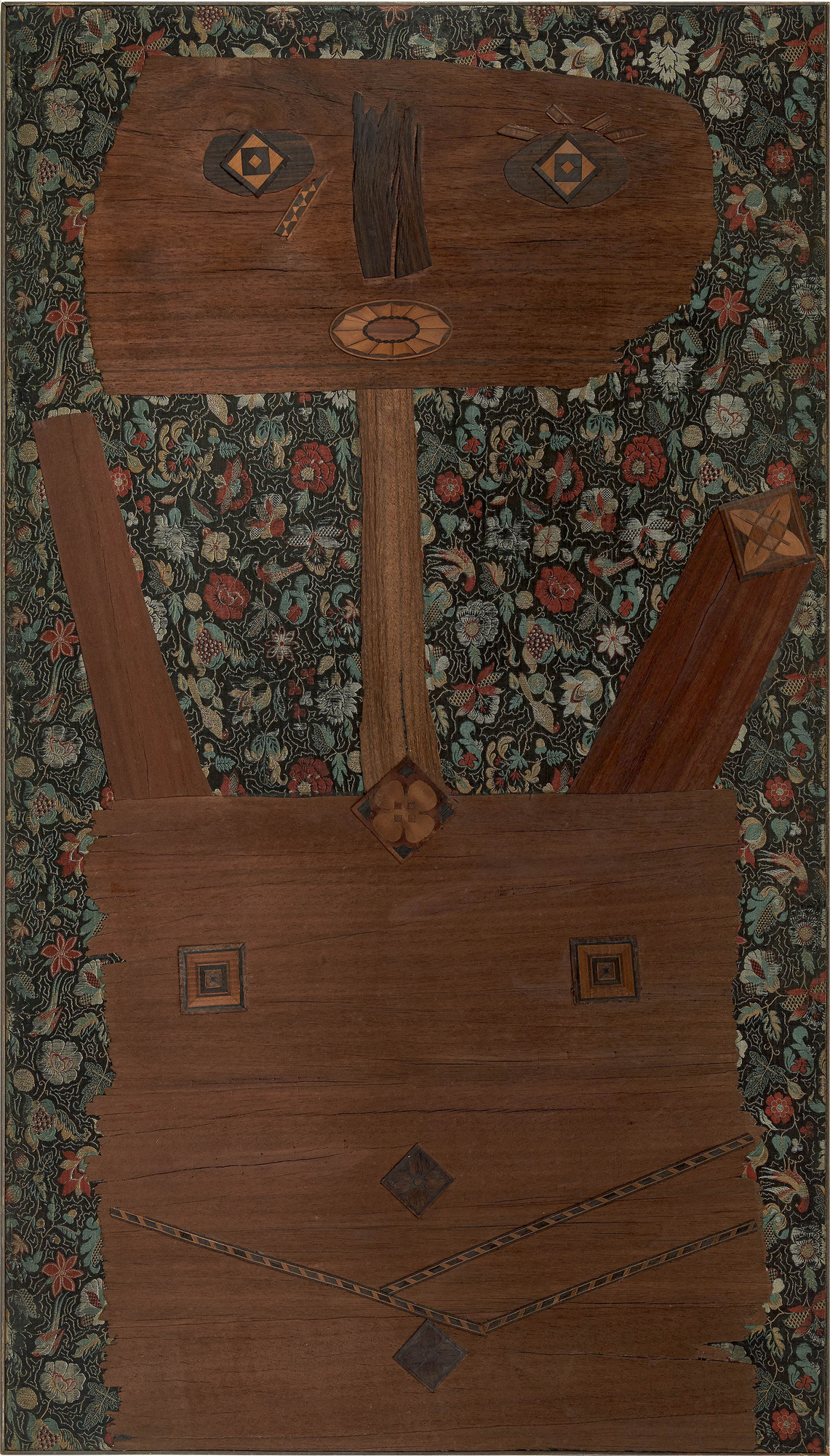 Collage, intarsio, impiallacciatura e stoffa su tavola