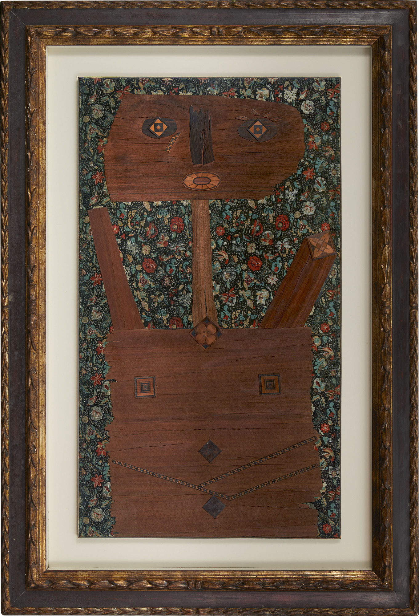 Lot 107 | Enrico Baj , Figura femminile , Collage, intarsio, impiallacciatura e stoffa su tavola