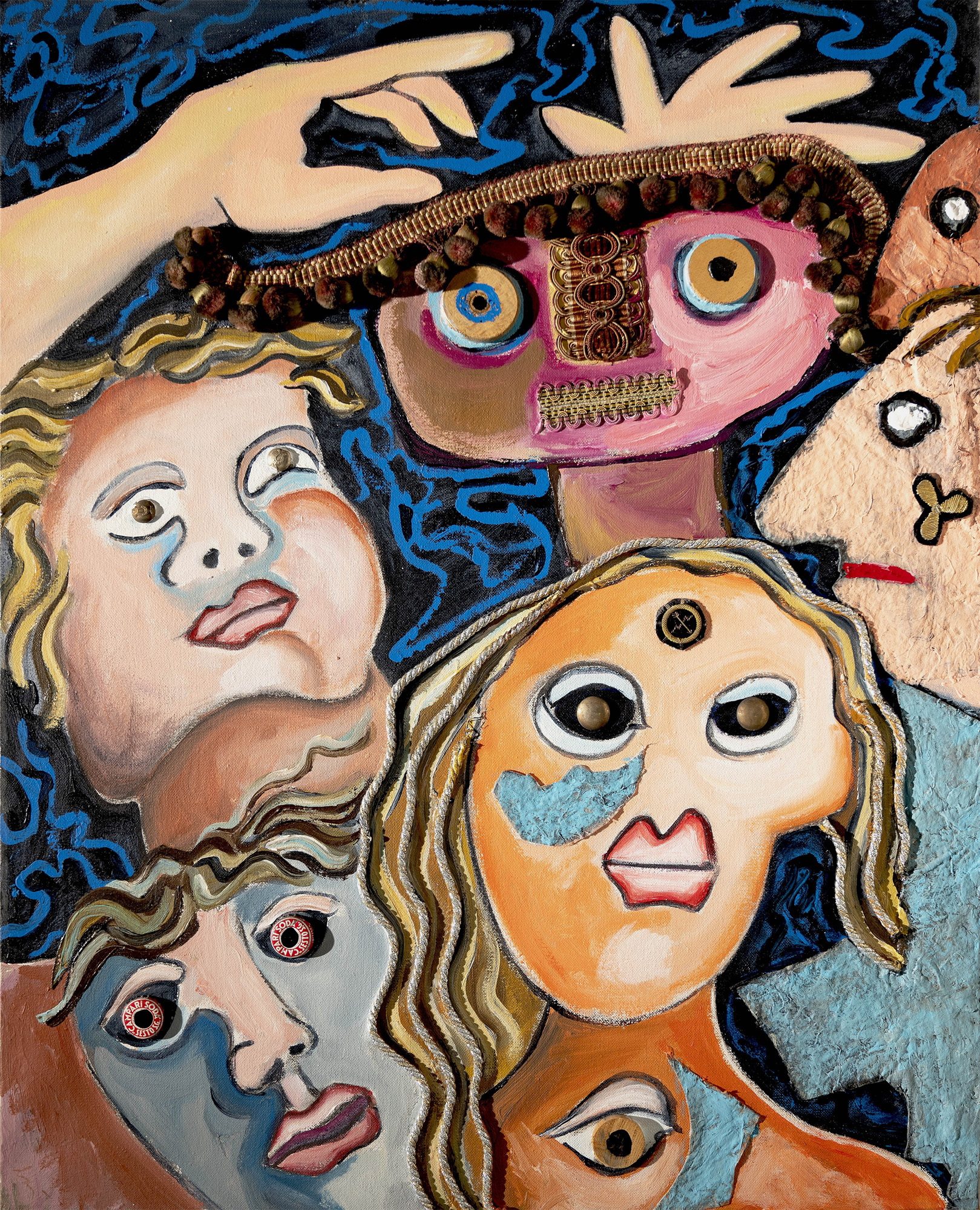 Enrico Baj , Visage aux deux mains , Tecnica mista su tela