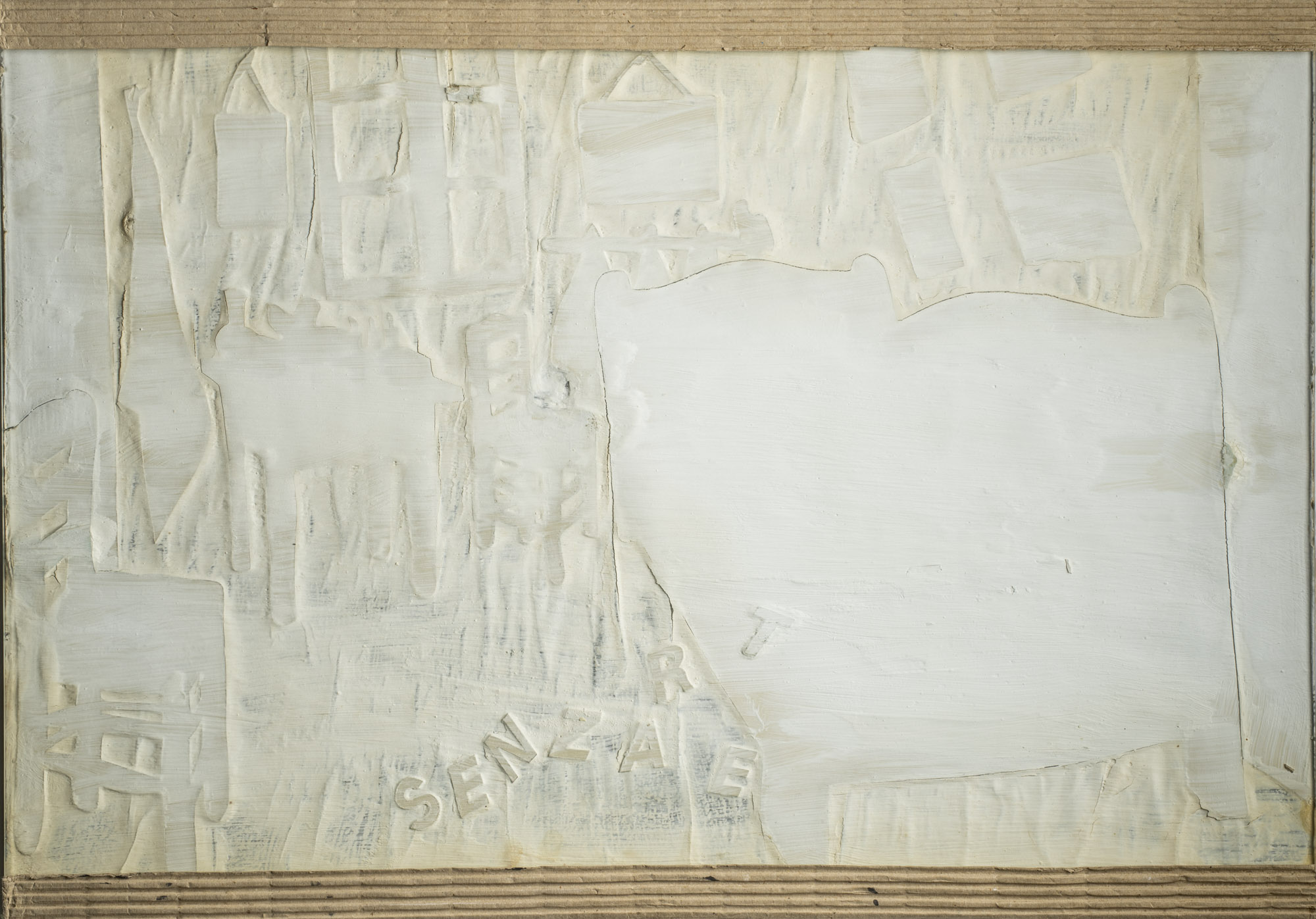 Gesso e collage su cartone applicato su tavola, vetro, cm. 55 x 78