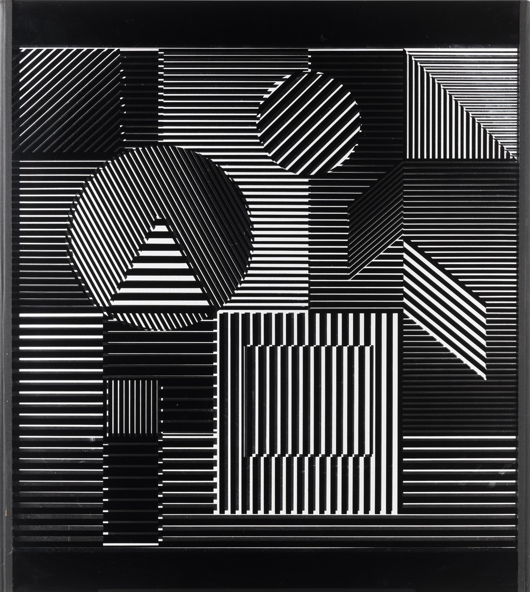 Multiplo scultura, plexiglas serigrafati sovrapposti, cm. 56 x 50,5 x 6,5