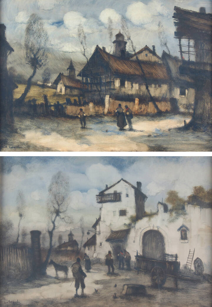 LUCIO CARGNEL<BR>1903-1998<BR>Coppia di dipinti raffiguranti contadini nell'aia