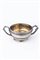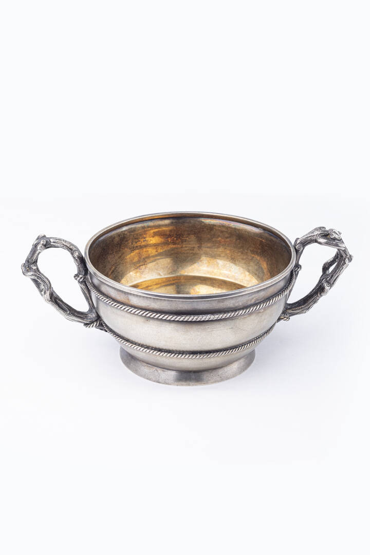 Coppa in argento, di forma circolare, decorata da fasce a motivi cordonati; doppio manico lavorato a rami intrecciati; interno vermeil.Reca punzoni città di Mosca, 88 Zolotnik, K. Fabergè, argentiere A.C, 1893