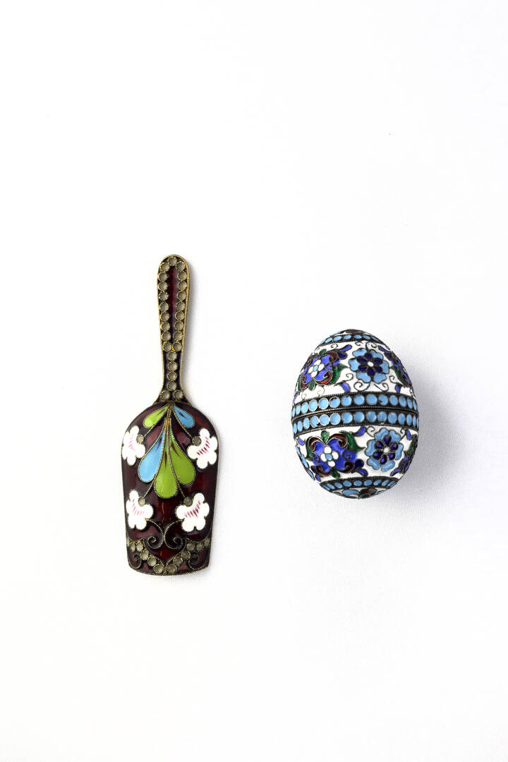 - scatola a forma di uovo, apribile, interamente decorata con smalti champlevé. Peso gr 43,3